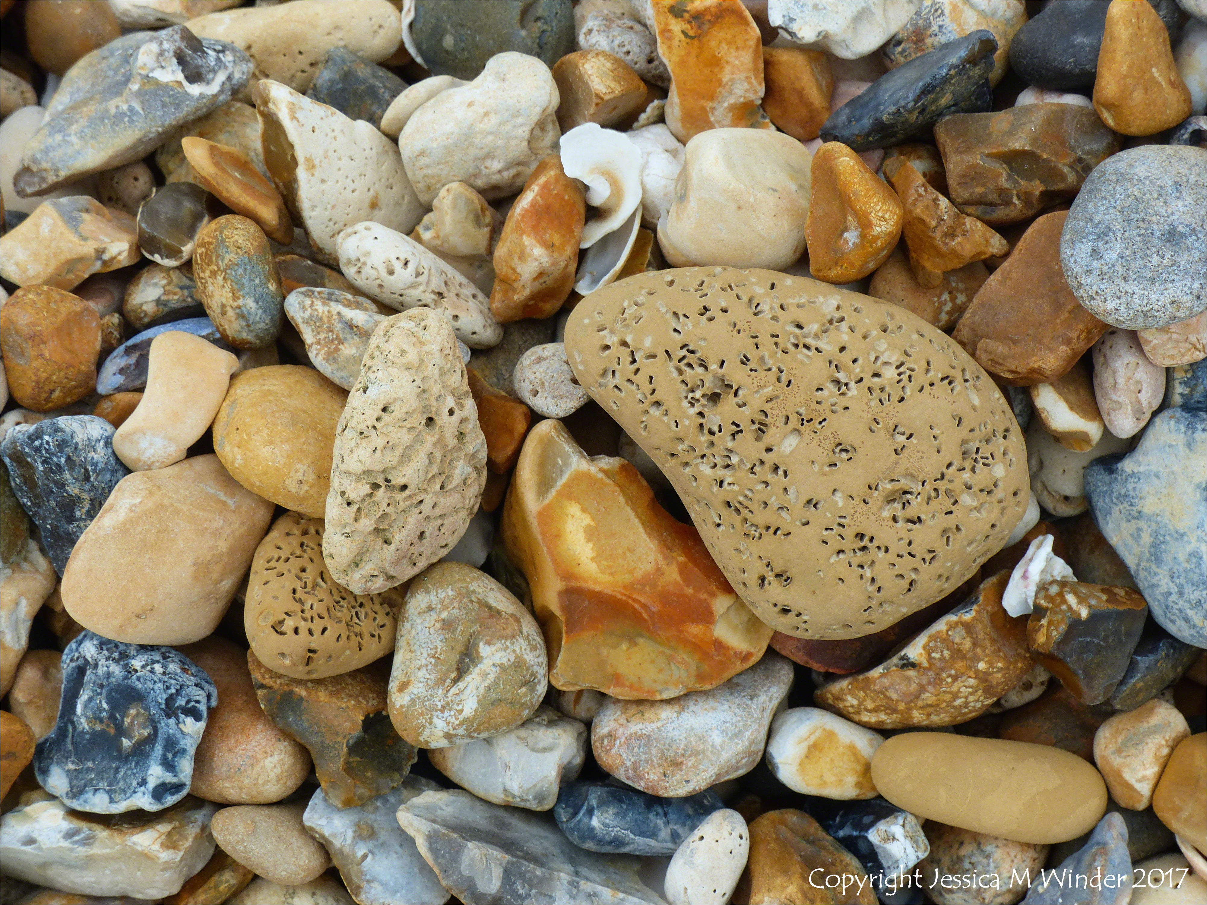 Whitstable Seashore Shells & Shingle 25 – Flints and beach stones (with holes made by marine organisms) on a shingle shore at Whitstable in Kent, England.