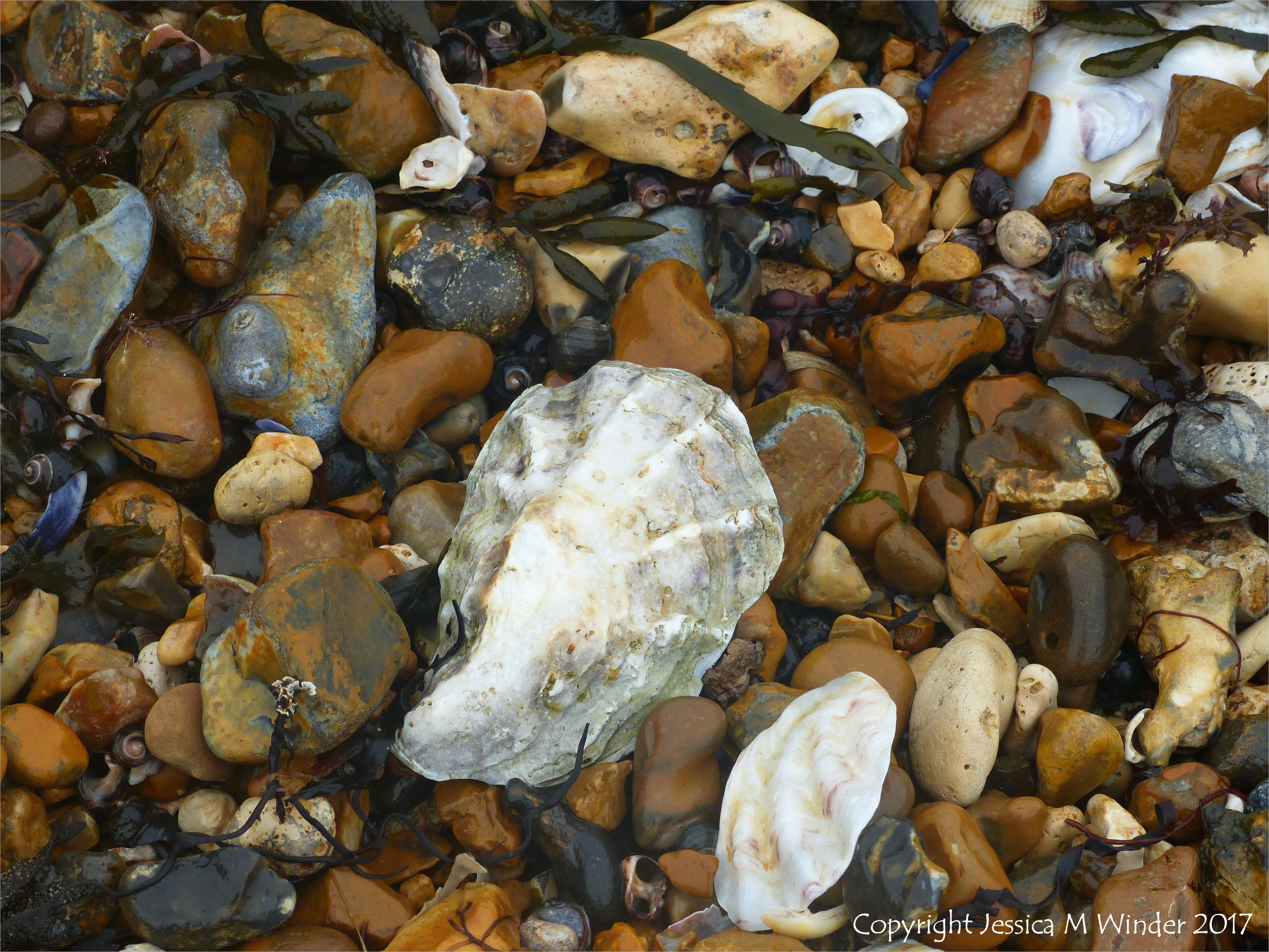 Whitstable Seashore Shells & Shingle 30 – Oysters and other seashells on a shingle strandline at Whitstable in Kent, England.