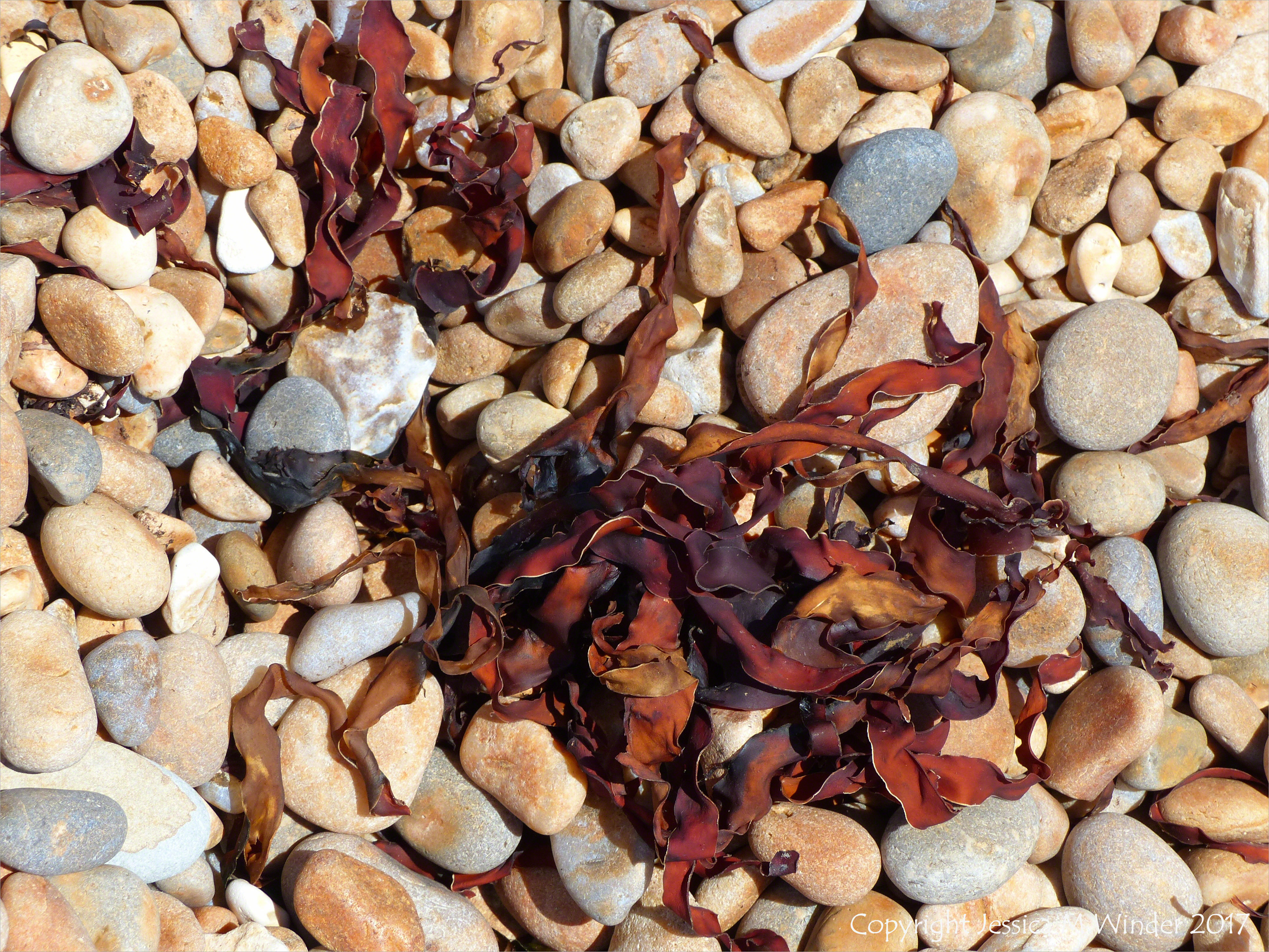 Seatown Strand 3 – Dried red seaweed washed ashore on pebbles at Seatown, Dorset, England, on the Jurassic Coast.