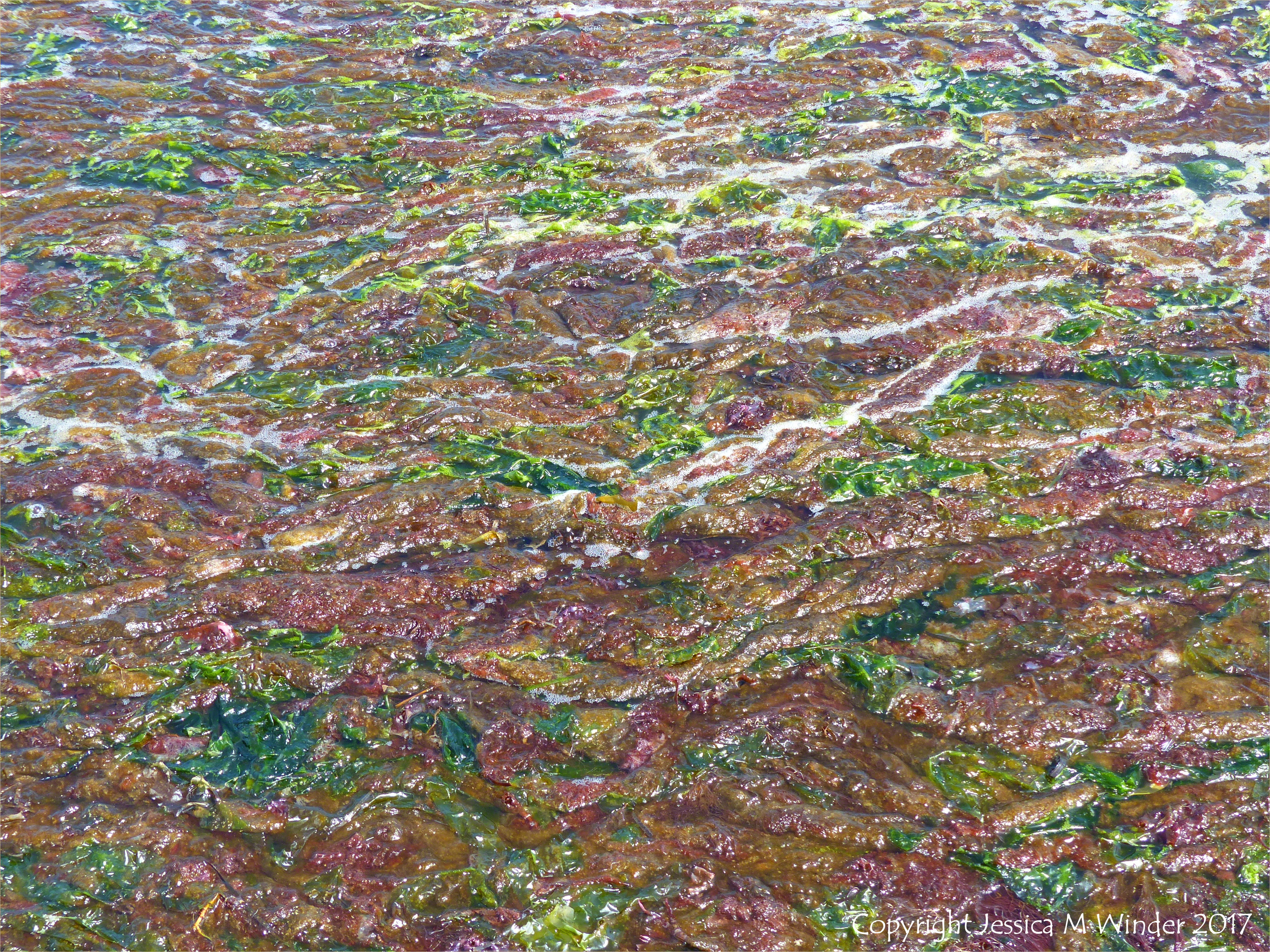 Studland Soft Seaweeds 11 – Detail of a multi-coloured floating mat of soft small, red, green, and brown seaweeds about to wash ashore at Studland Bay, Dorset, England, 21 May 2017.