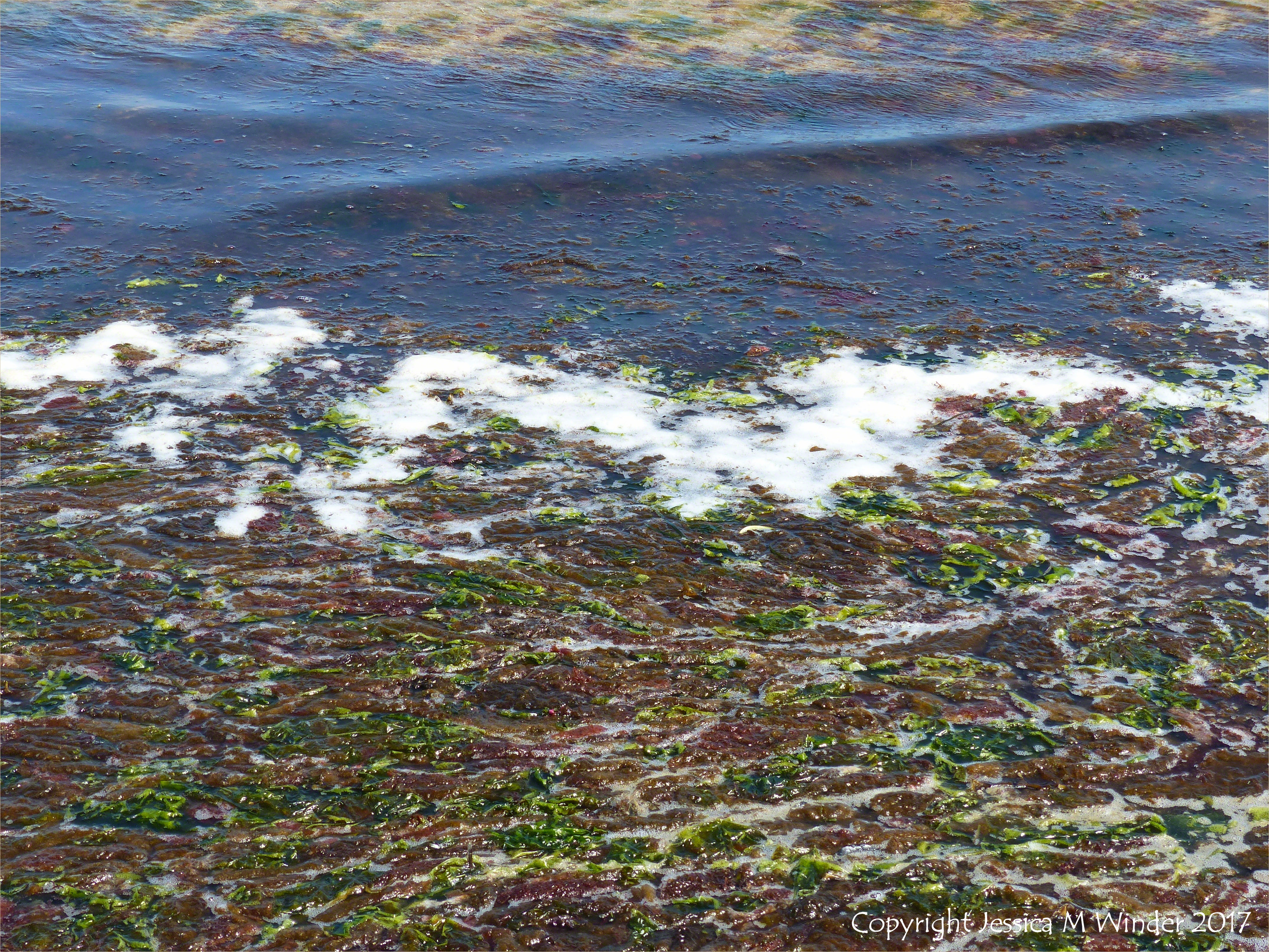 Studland Soft Seaweeds 12 – Detail of a multi-coloured floating mat of soft small, red, green, and brown seaweeds about to wash ashore at Studland Bay, Dorset, England, 21 May 2017.
