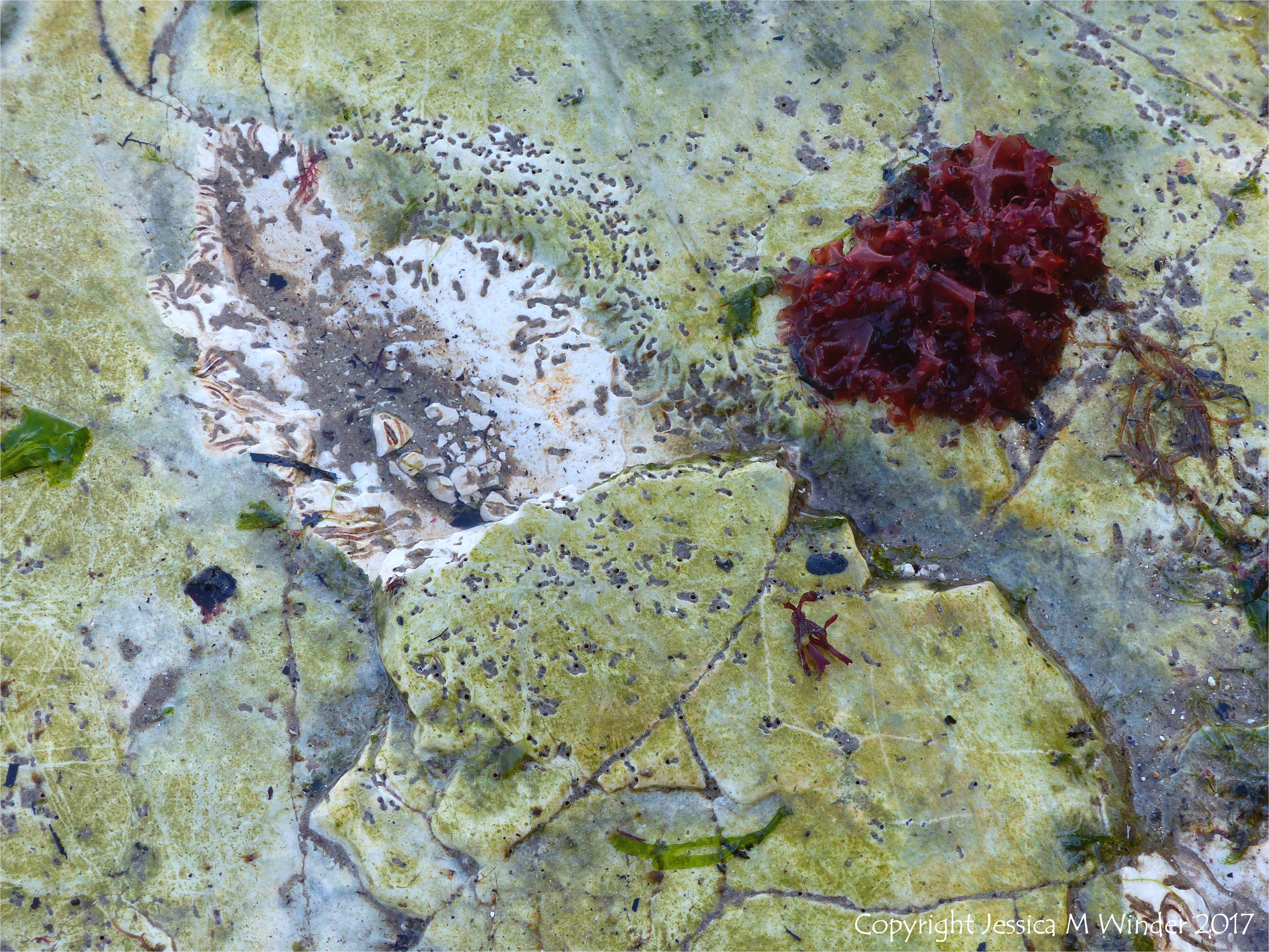 Worm Holes in Studland Chalk 8 – Small holes made by marine worms in chalk bedrock at South Beach in Studland Bay. The holes are mostly still occupied by the living worms, as seen by the combined mucus and mud tubes that line the burrows which remain in situ. The small hole in the tube is where the worm protrudes two palps (feelers) for feeding purposes when it is underwater. The holes are most likely made by Spionid polychaete worms of the Polydora genus, possibly Polydora ciliata (Johnston).