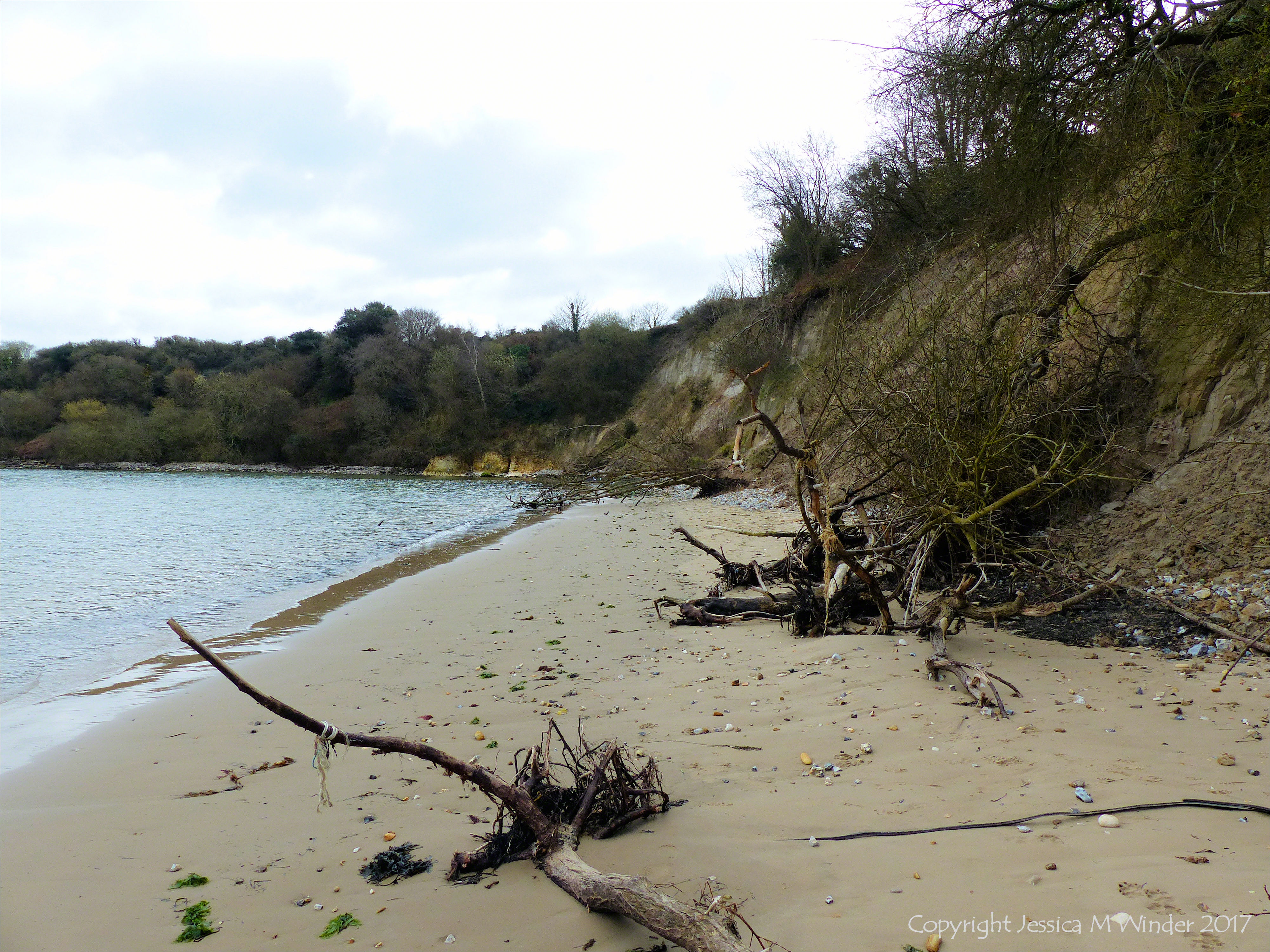 Erosion At South Beach (March 2017) 3 – Small trees lying horizontally at the base of a soft cliff, where they have fallen as the result of erosion and undermining of the lower cliff materials by destructive storm waves, which are an active agent of coastline change. Photographed at South Beach, Studland Bay, Dorset, England.