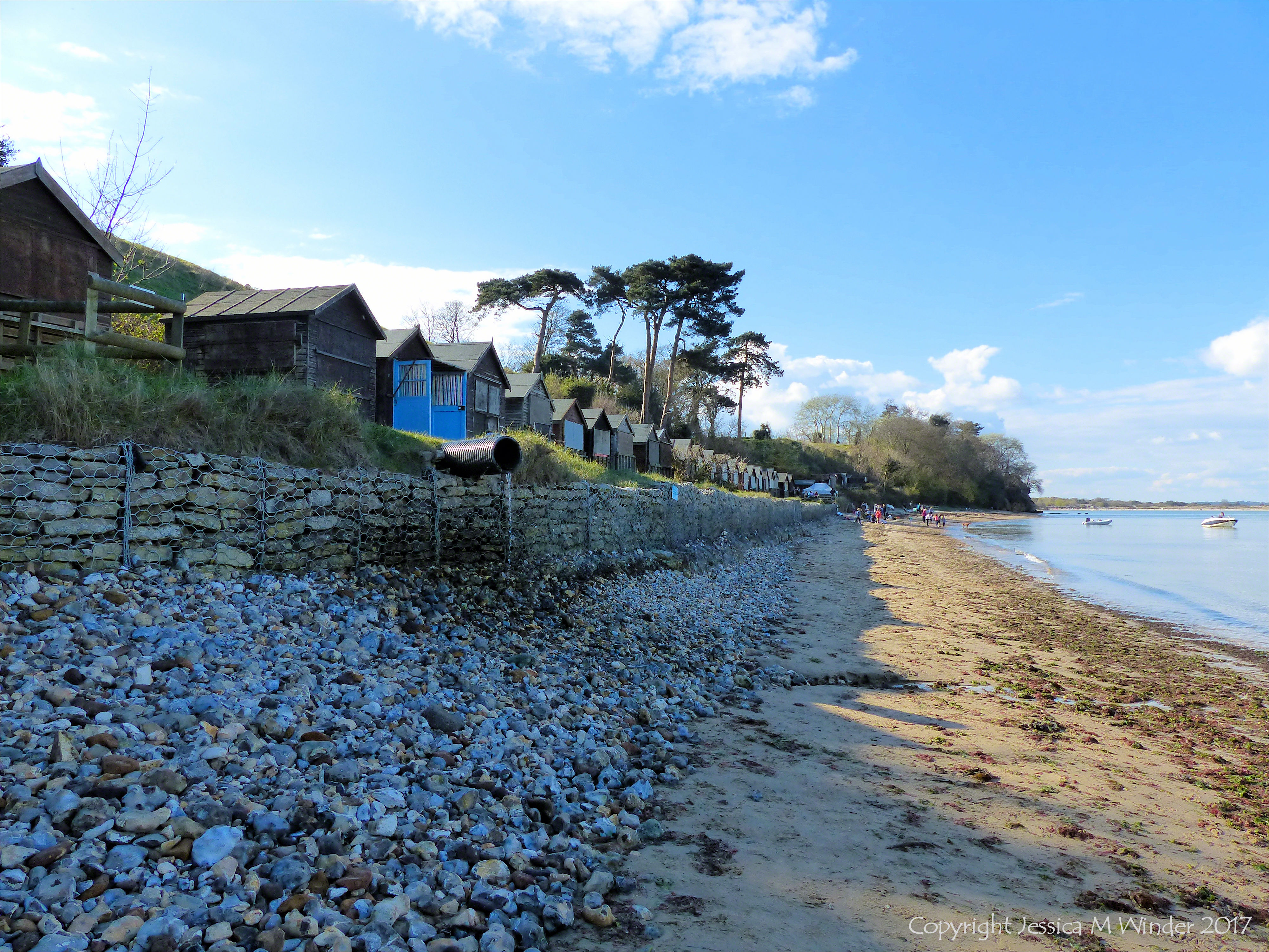 Gabions at South Beach (April 2017) 8 – Stone-filled wire cages known as gabions, stacked into a sea defence wall for protection against coastal erosion and flooding at Studland Bay in Dorset, England.