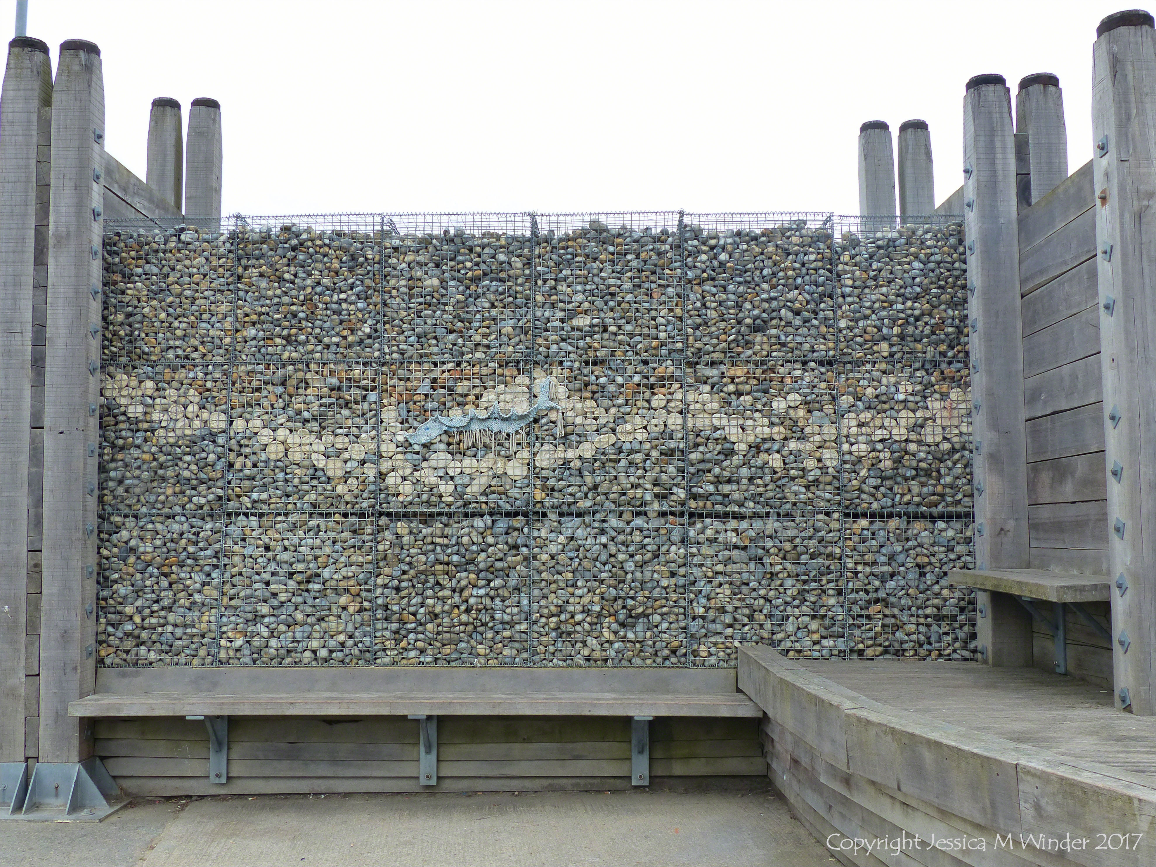 The Deck at Dead Man’s Corner 3 – Construction with stone-filled gabions and timbers as seating and stage for events at Whitstable Harbour, Kent, England.