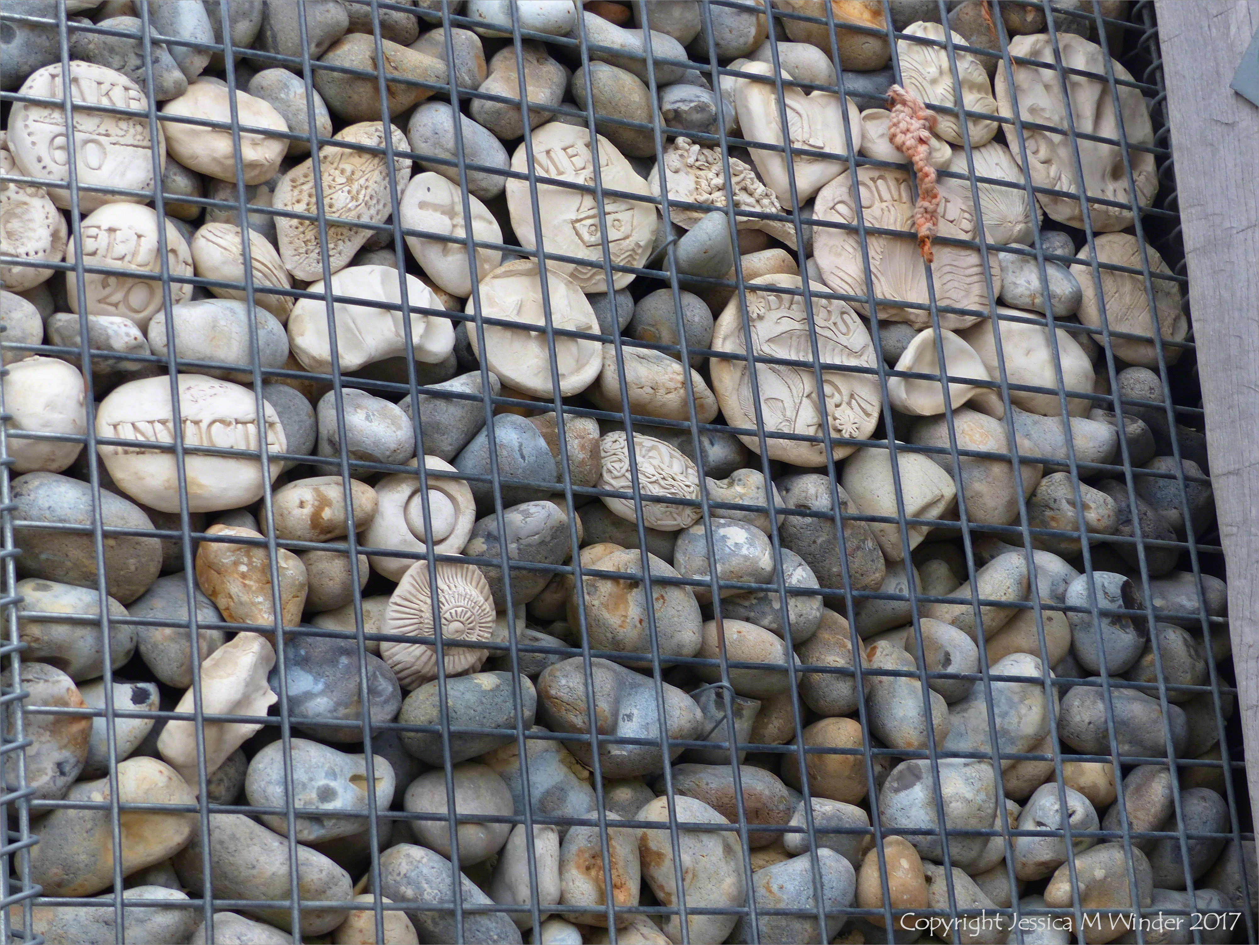 The Deck at Dead Man’s Corner 9 – Detail of the natural pebbles and decorative hand-made ceramic pebbles in wire cages called gabions used in the construction of Dead Man’s Corner Deck with seating and stage for events at Whitstable Harbour in Kent, England.