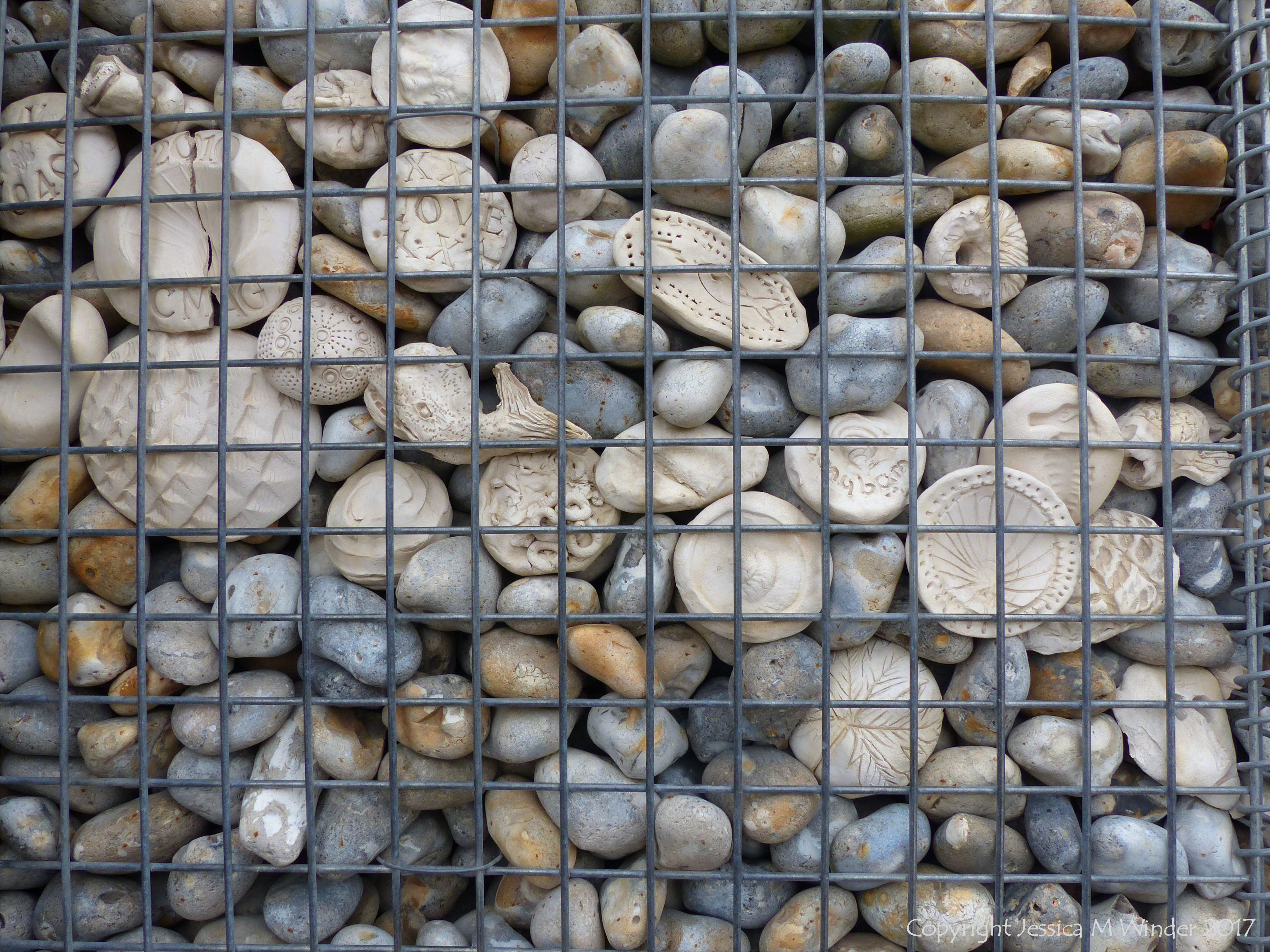 The Deck at Dead Man’s Corner 15 – Detail of the natural pebbles and decorative hand-made ceramic pebbles in wire cages called gabions used in the construction of Dead Man’s Corner Deck with seating and stage for events at Whitstable Harbour in Kent, England.