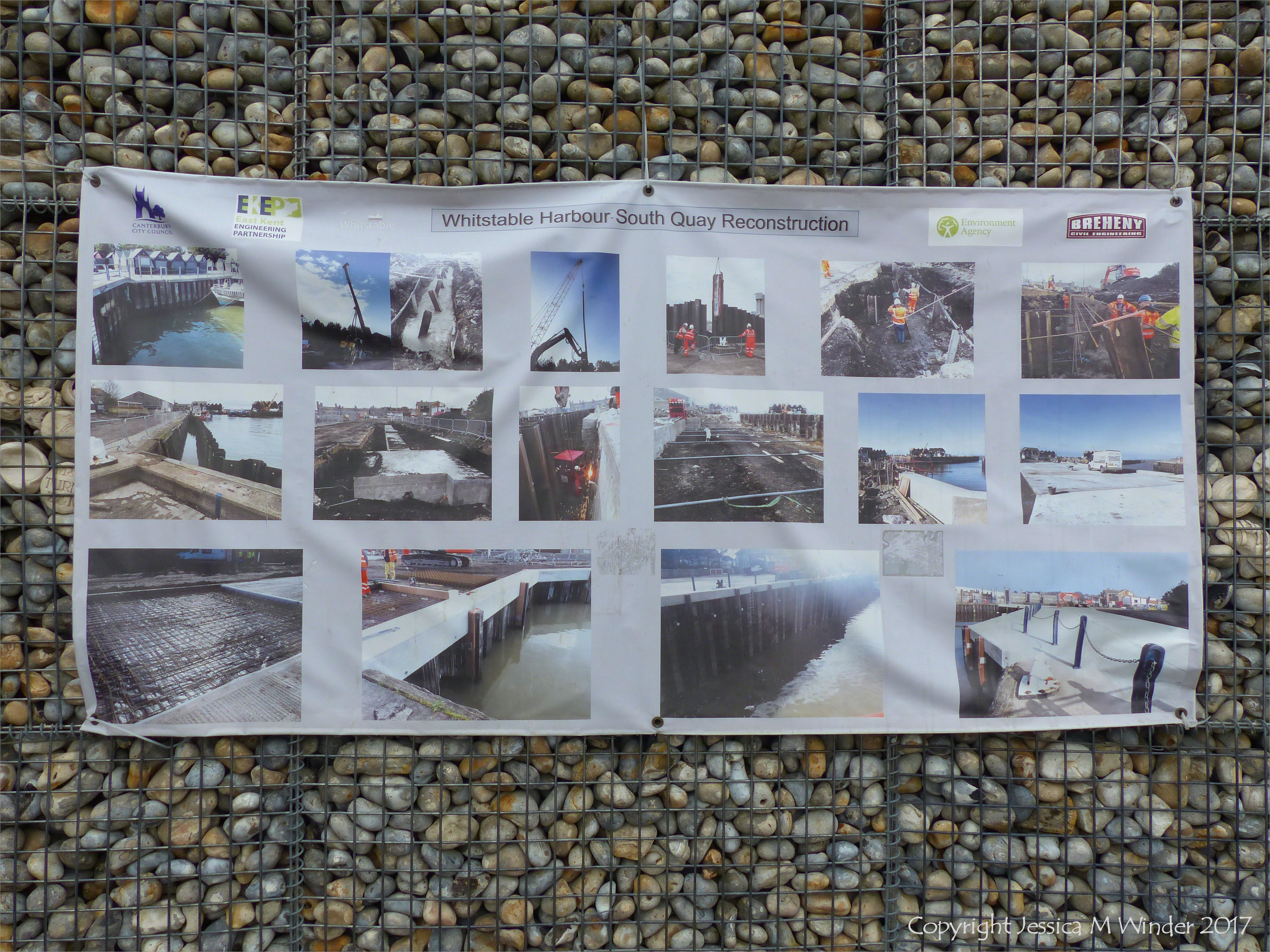 The Deck at Dead Man’s Corner 20 – Detail of the natural pebbles and decorative hand-made ceramic pebbles in wire cages called gabions used in the construction of Dead Man’s Corner Deck with seating and stage for events at Whitstable Harbour in Kent, England.