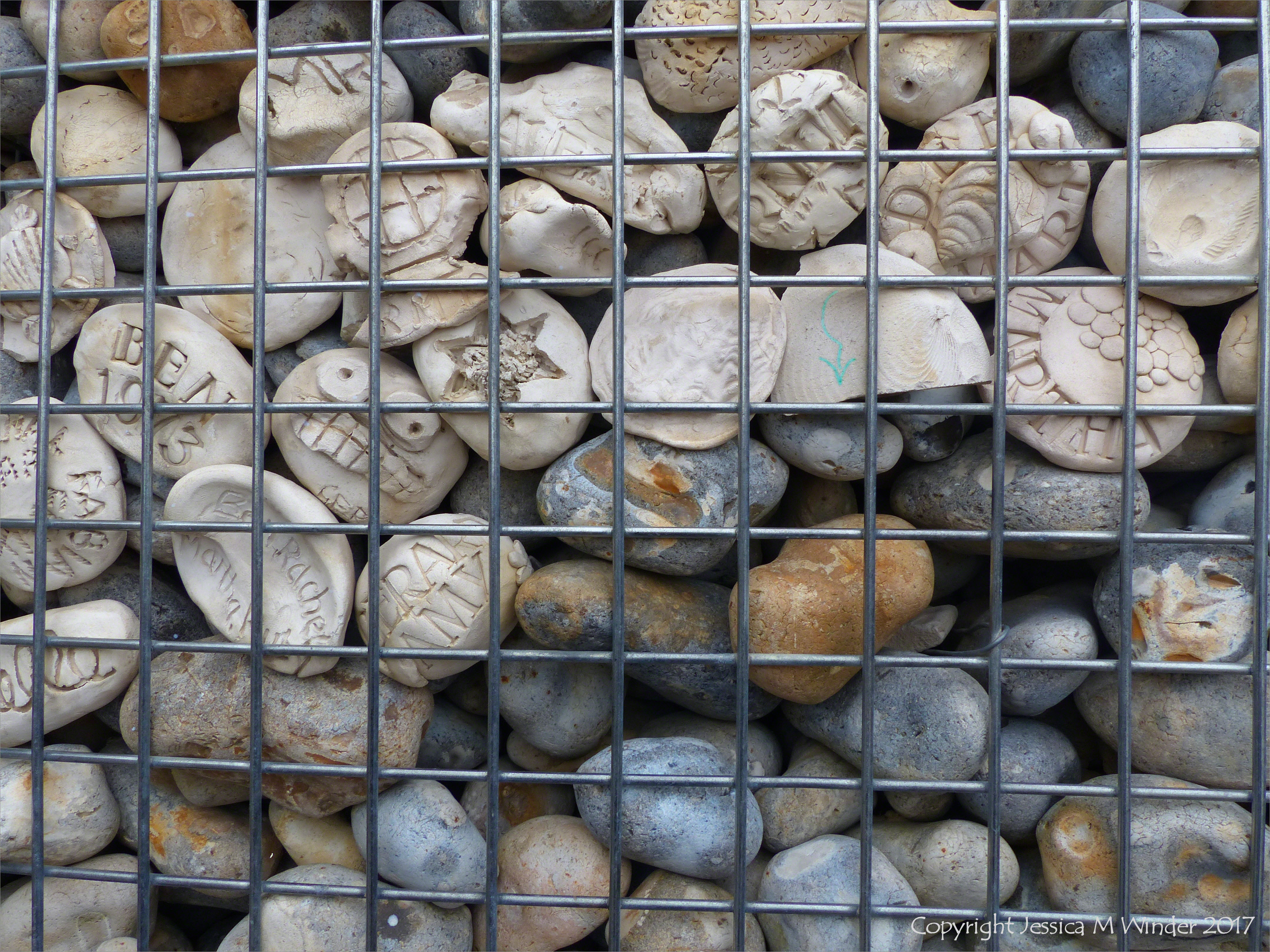 The Deck at Dead Man’s Corner22 – Detail of the natural pebbles and decorative hand-made ceramic pebbles in wire cages called gabions used in the construction of Dead Man’s Corner Deck with seating and stage for events at Whitstable Harbour in Kent, England.