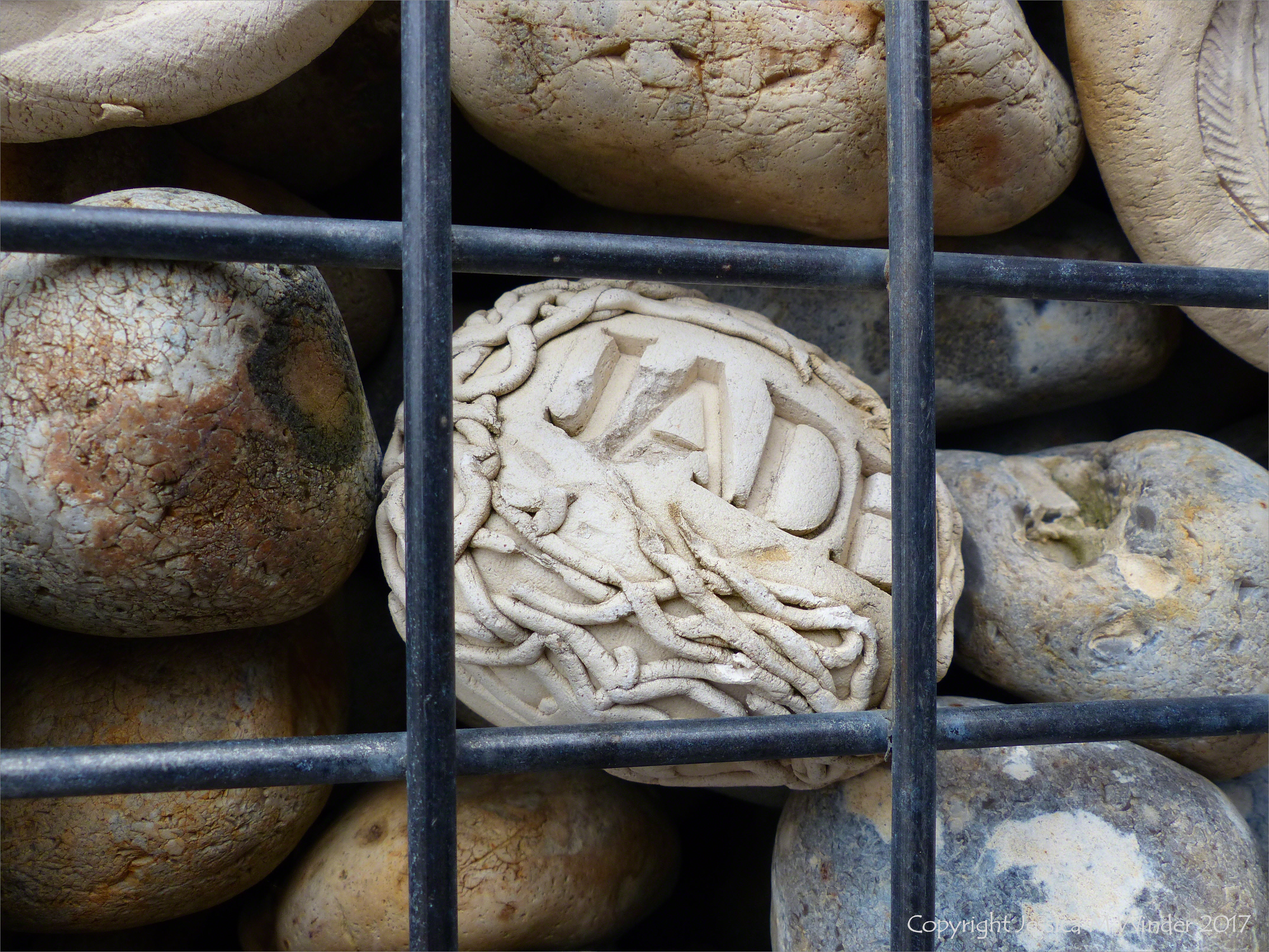 The Deck at Dead Man’s Corner 24 – Detail of the natural pebbles and decorative hand-made ceramic pebbles in wire cages called gabions used in the construction of Dead Man’s Corner Deck with seating and stage for events at Whitstable Harbour in Kent, England.