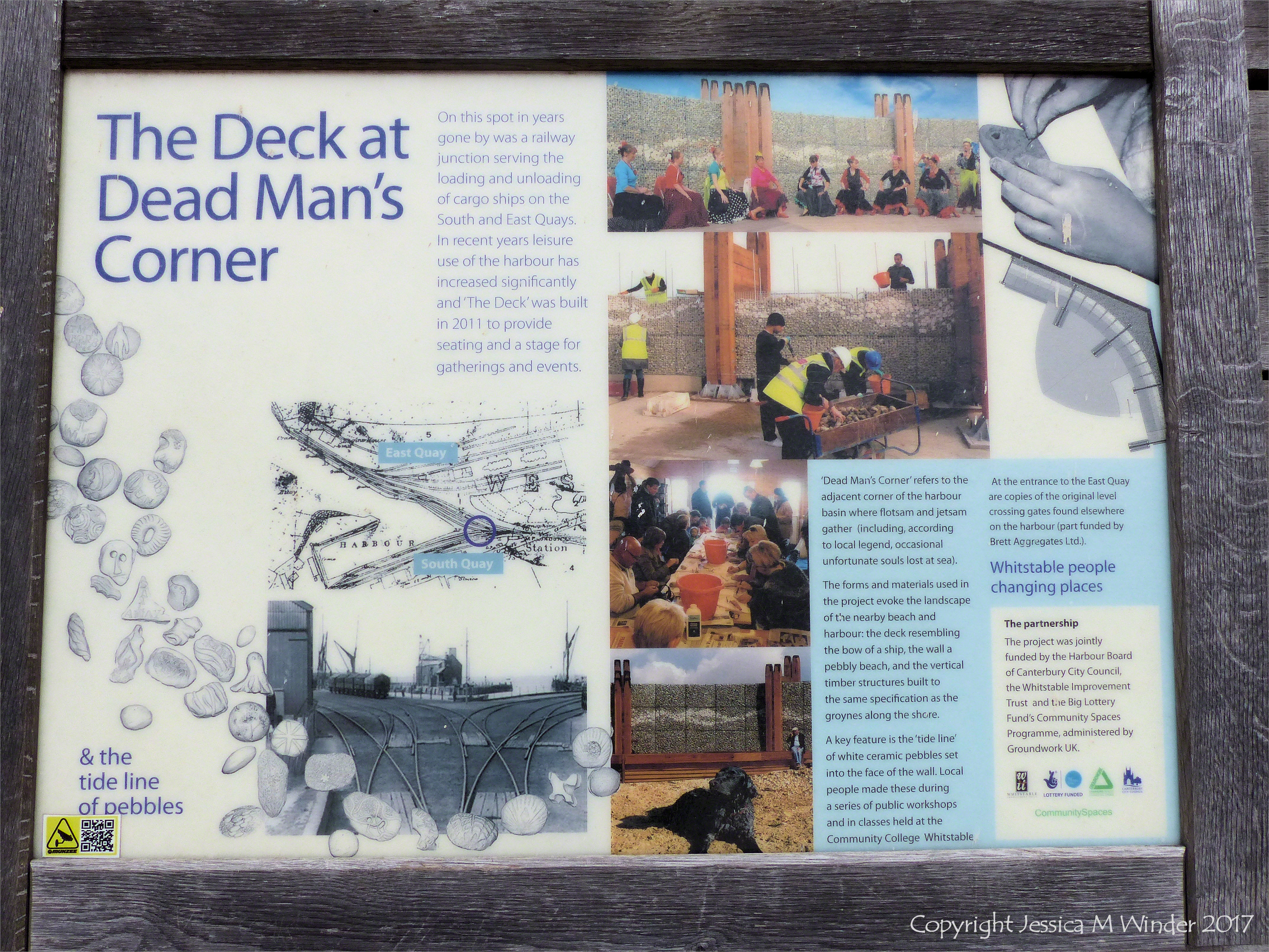 The Deck at Dead Man’s Corner 2 – Explanatory sign at Dead Man’s Corner Deck which uses wire cages of natural flint pebbles together with white decorated ceramic pebbles in Whitstable, Kent, England.