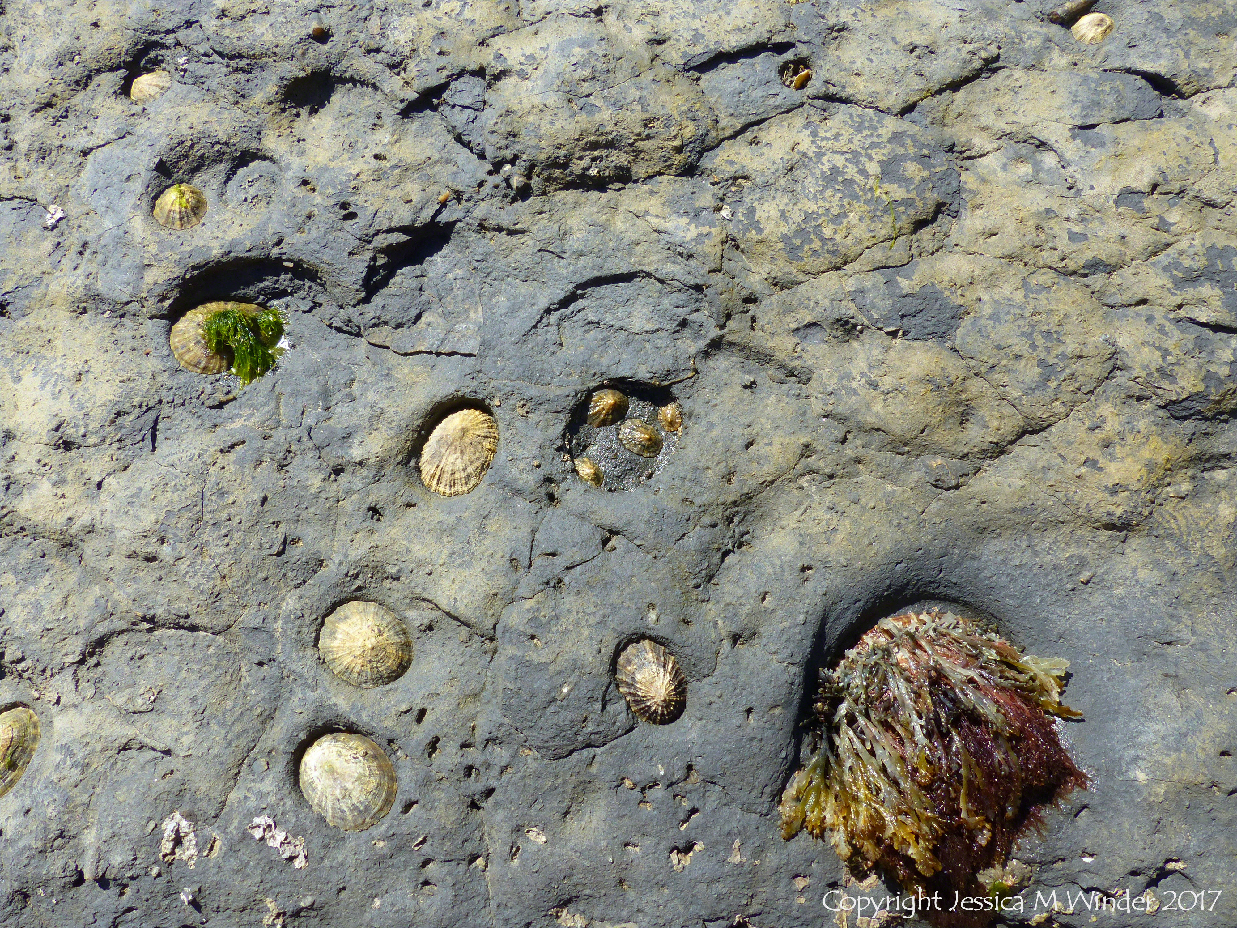 Limpet Bioerosion Seatown 8 – Limpets in their rock home bases on the beach at Seatown in Dorset. One large limpet festooned with young seaweeds of various types and colours.