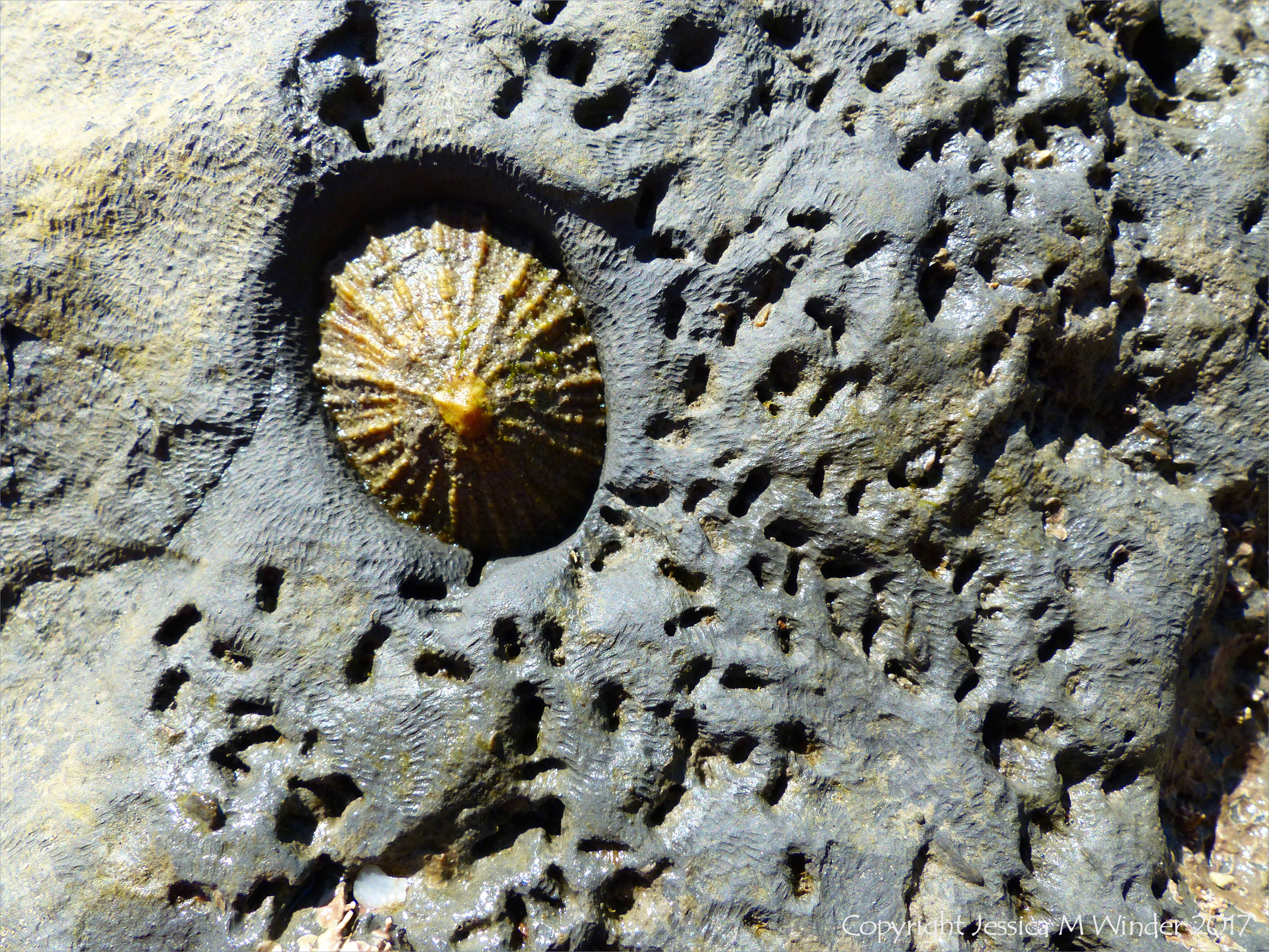 Limpet Bioerosion Seatown 10 – Living limpet attached to rock with burrows of mud tube dwelling bristle worms at Seatown in Dorset, England, with patterns carved into the soft mudstone by its radula teeth while feeding
