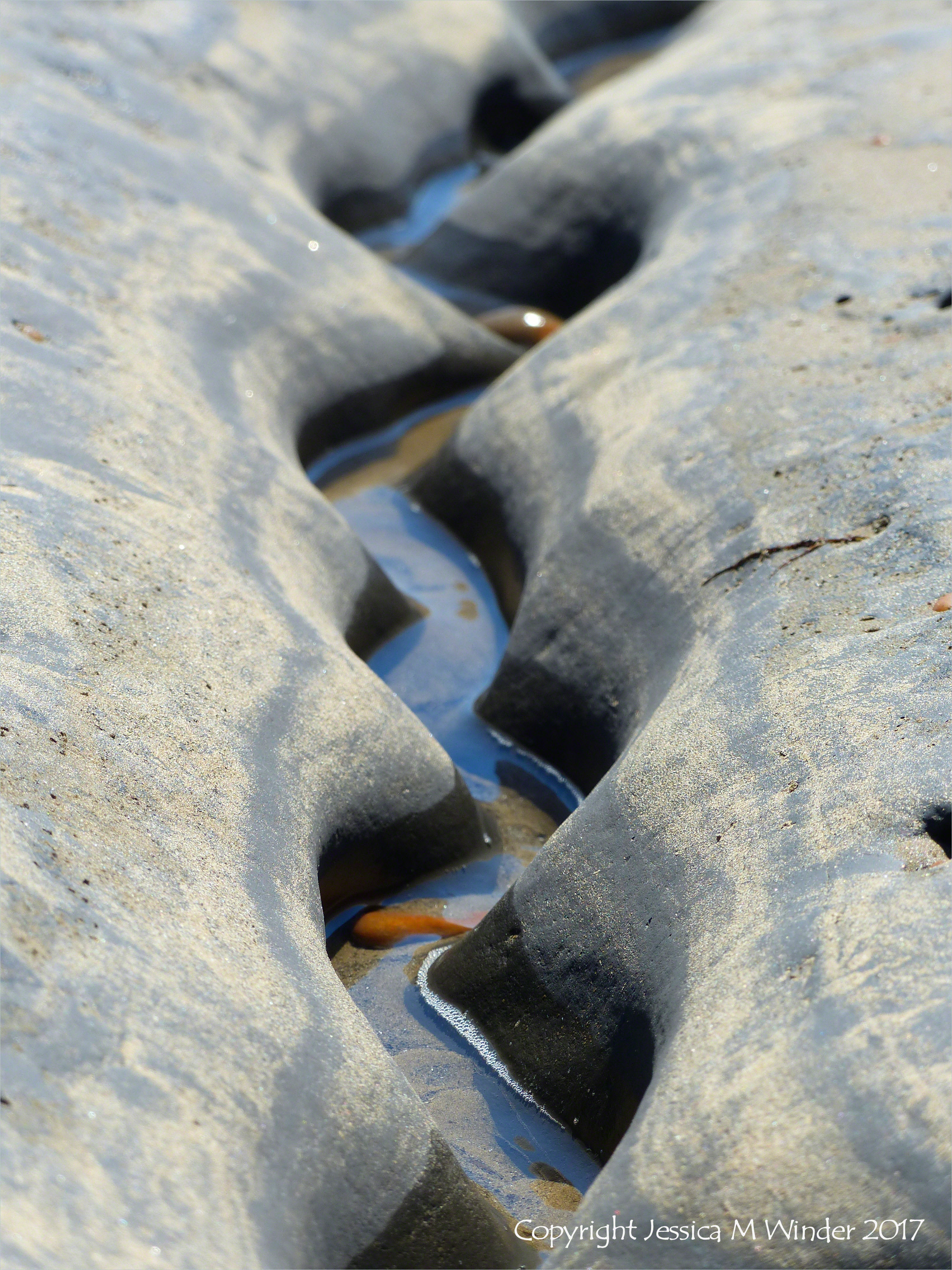 Sinuous Rock Channels at Seaton 9 – Narrow and sinuous sea-water drainage channel wearing into intertidal layers of calcareous mudstone of the Belemnite Member of the Charmouth Mudstone Formation at Seatown in Dorset, England. One of many active natural coastal processes wearing away and changing the shoreline.