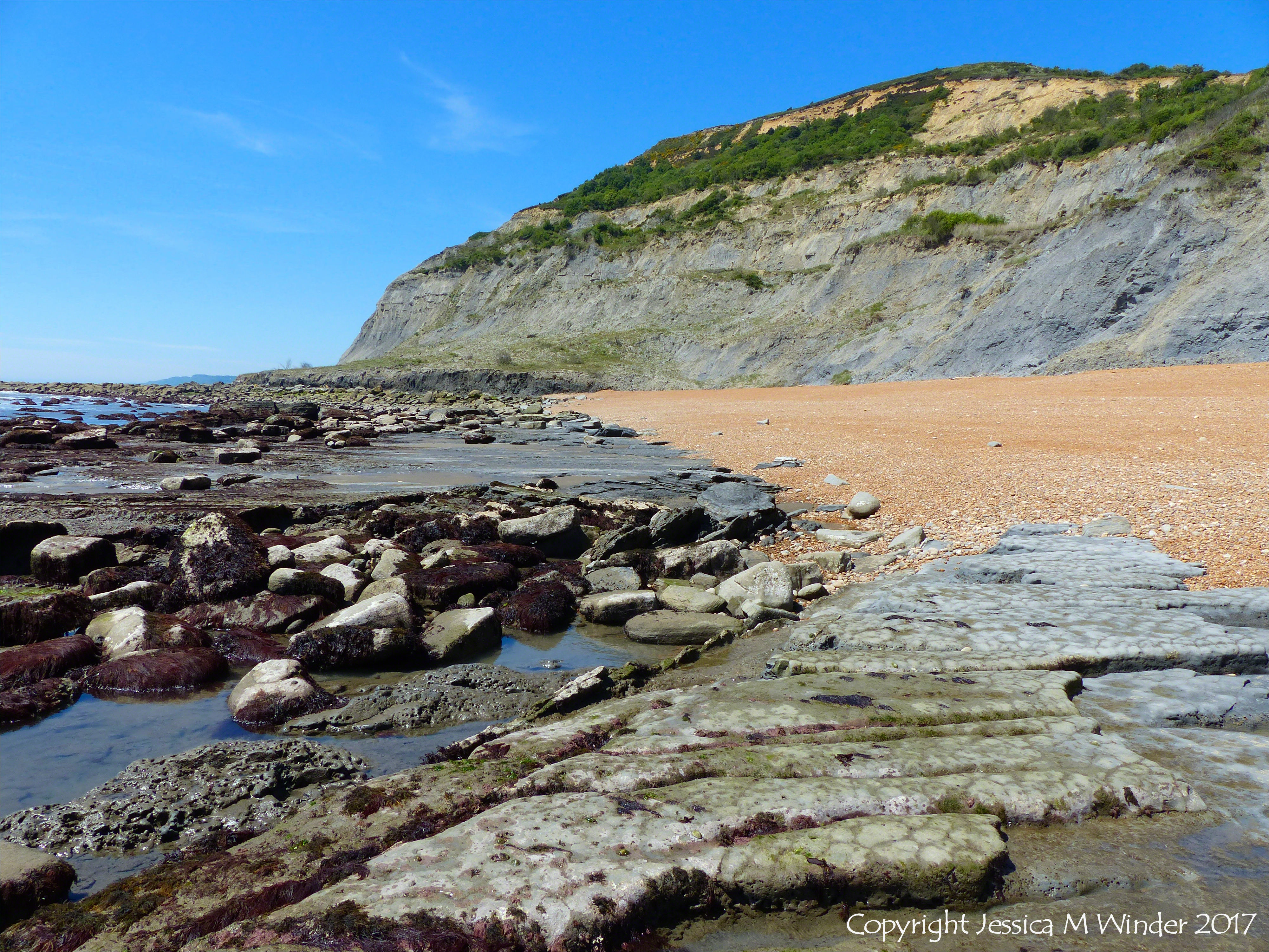 Seatown Dissected Mudstone 11 – View at Seatown looking west towards Golden Cap, showing eroding calcareous mudstone rock layers along the waterline.