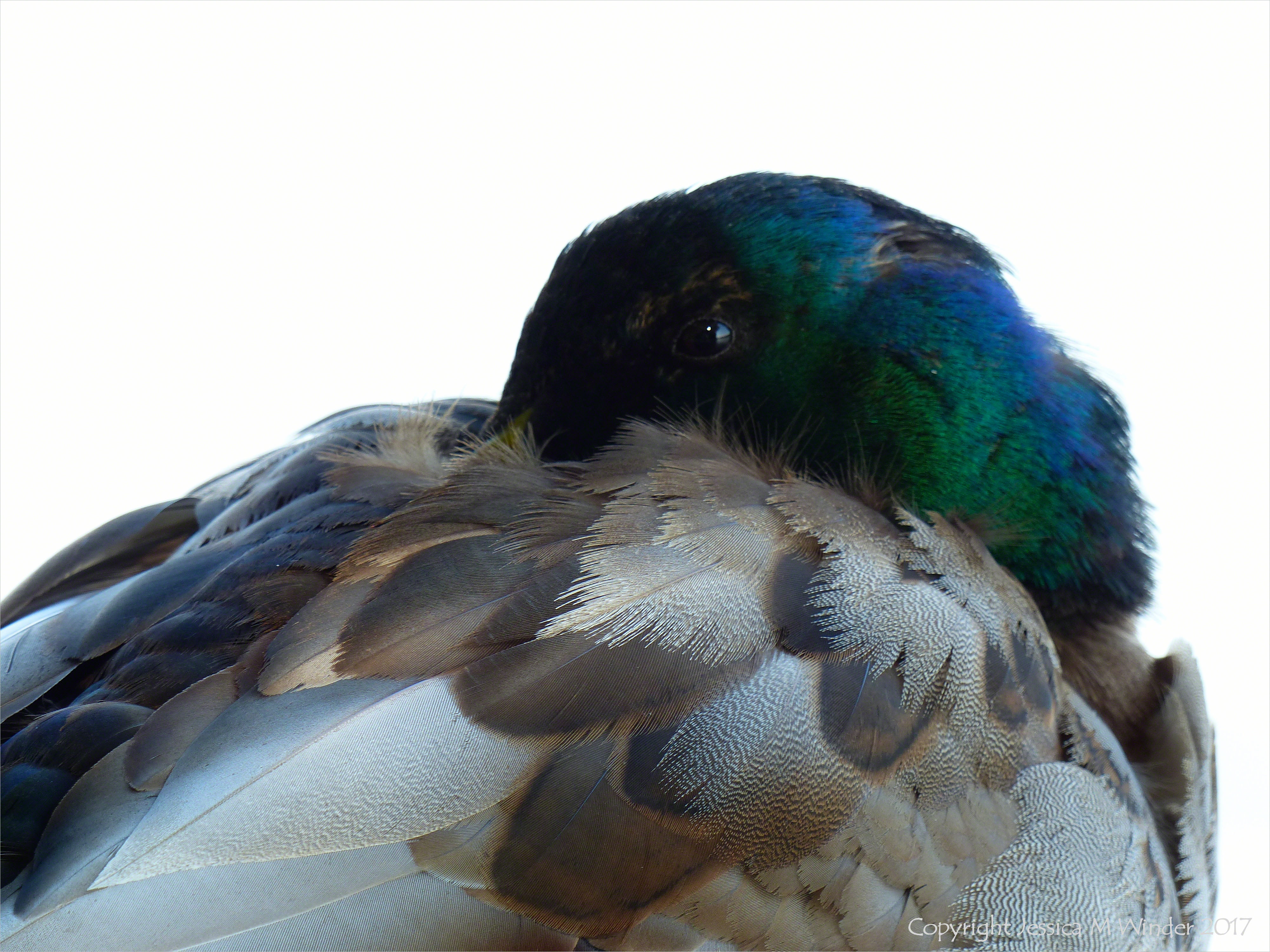 South Bank Ducks 1 – Close-up of a resting duck (mallard , I think), one of a pair perched on railings on the South Bank by the Thames in London
