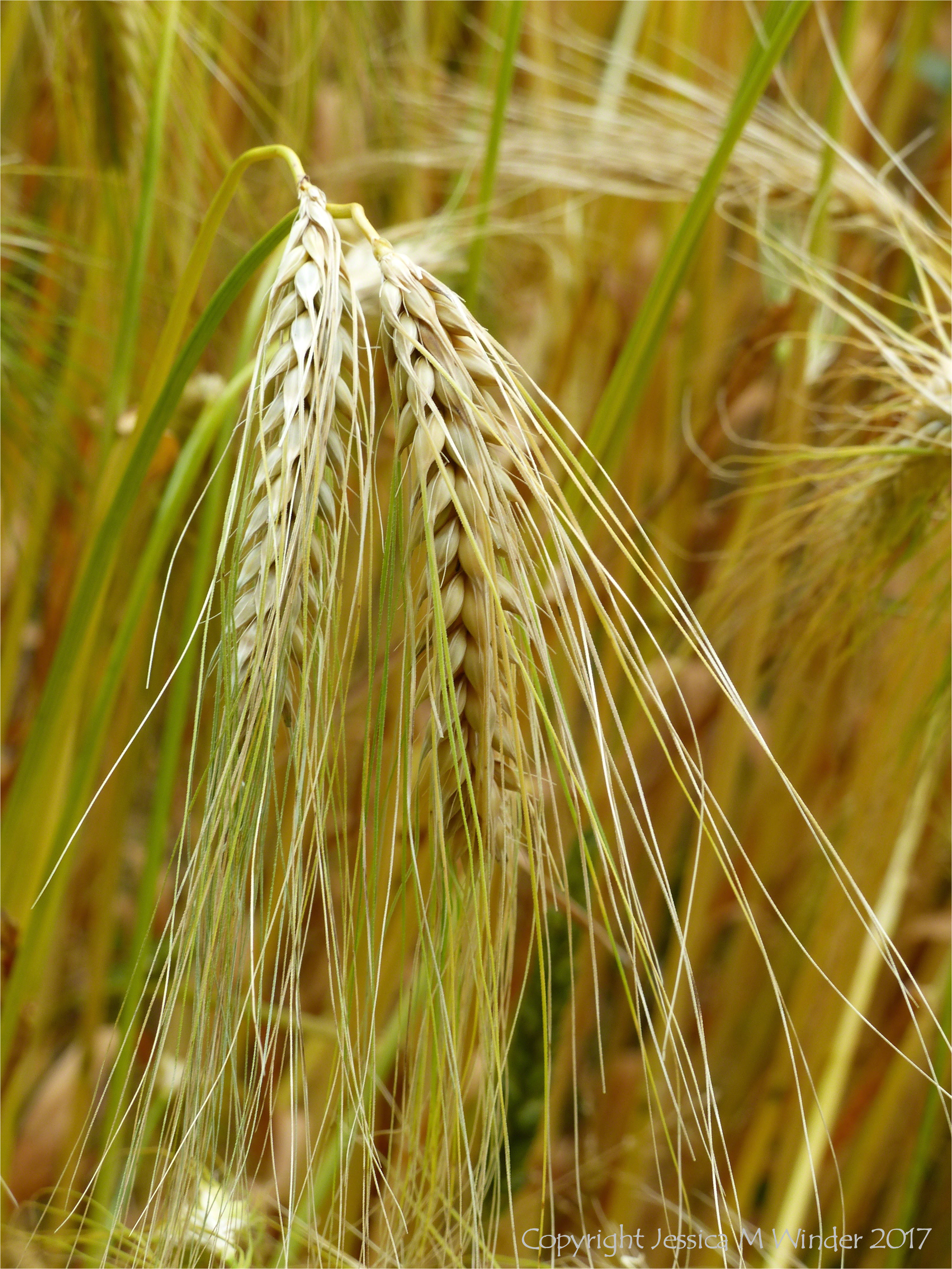 Ripening Barley CD 3 – Ripening barley in a Dorset field at Charlton Down 1st July 2017. The blond whiskers of the seed spikelets on the drooping heads of barley seem to create acres of pale gold cobwebs to delight the eye.