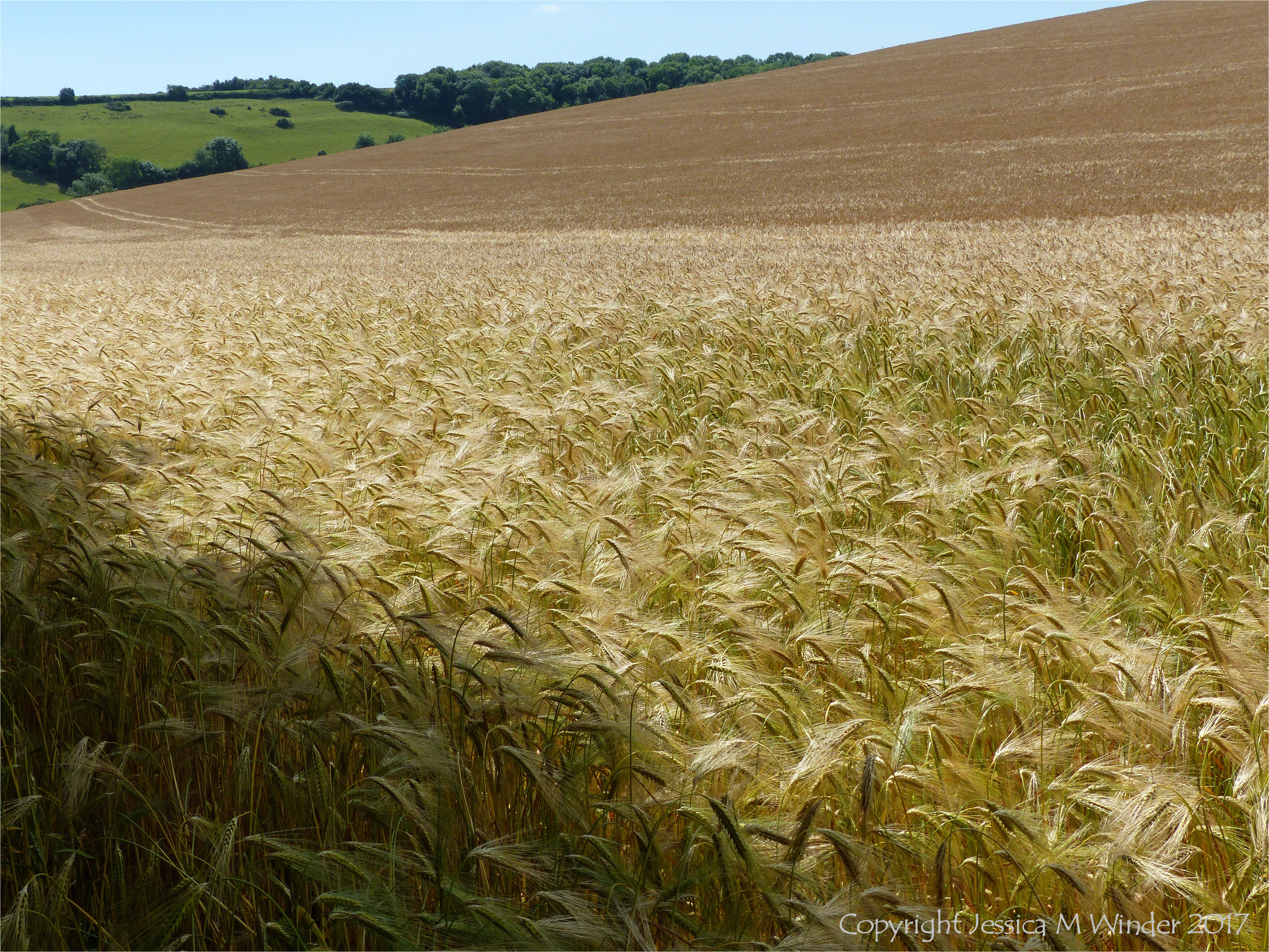 Ripening Barley CD 5 – Ripening barley in a Dorset field at Charlton Down 1st July 2017. The blond whiskers of the seed spikelets on the drooping heads of barley seem to create acres of pale gold cobwebs to delight the eye.