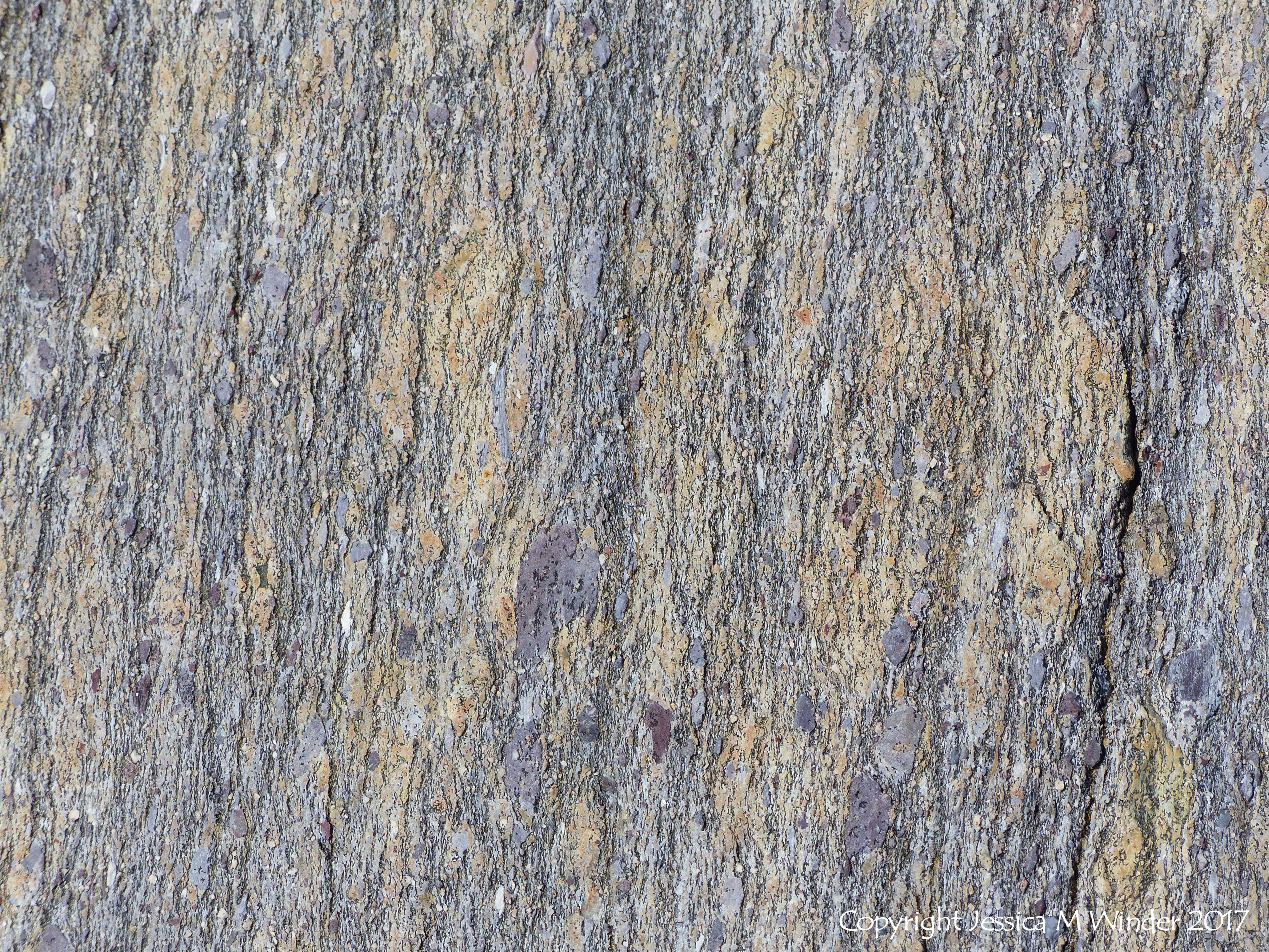Volcanic Tuff Louisbourg Lighthouse 23 – Close-up rock texture of tuff made of compacted volcanic ash and small rock fragments from explosive volcanic eruptions in the Neoproterozoic period on Cape Breton in Nova Scotia, Canada, near Louisbourg Lighthouse.