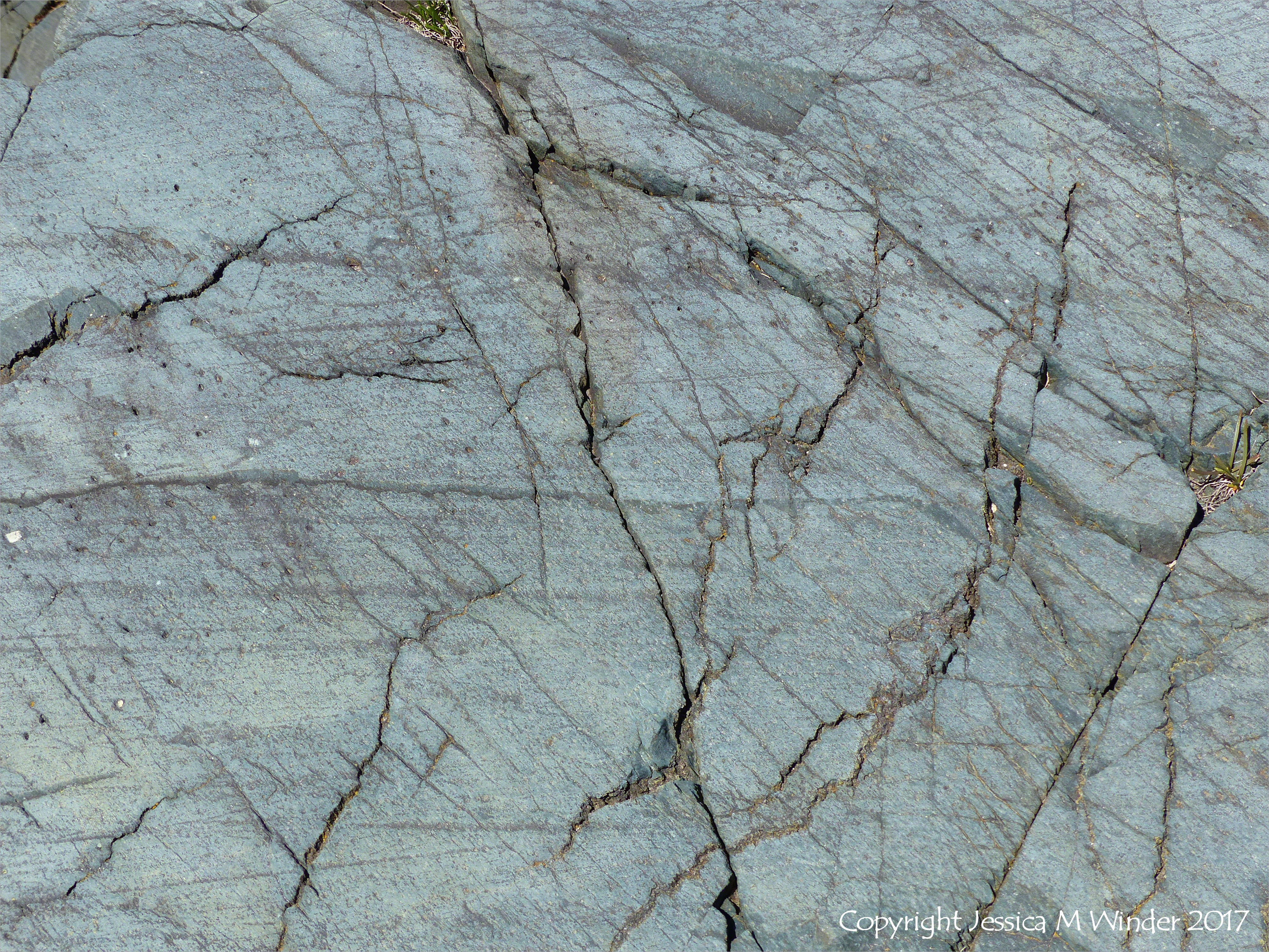 Volcanic Tuff Louisbourg Lighthouse 33 – Rock texture of solidified lava that has intruded into tuff at Louisbourg Lighthouse on Cape Breton Island, Nova Scotia, Canada, showing what appears to be striations from an ice sheet.