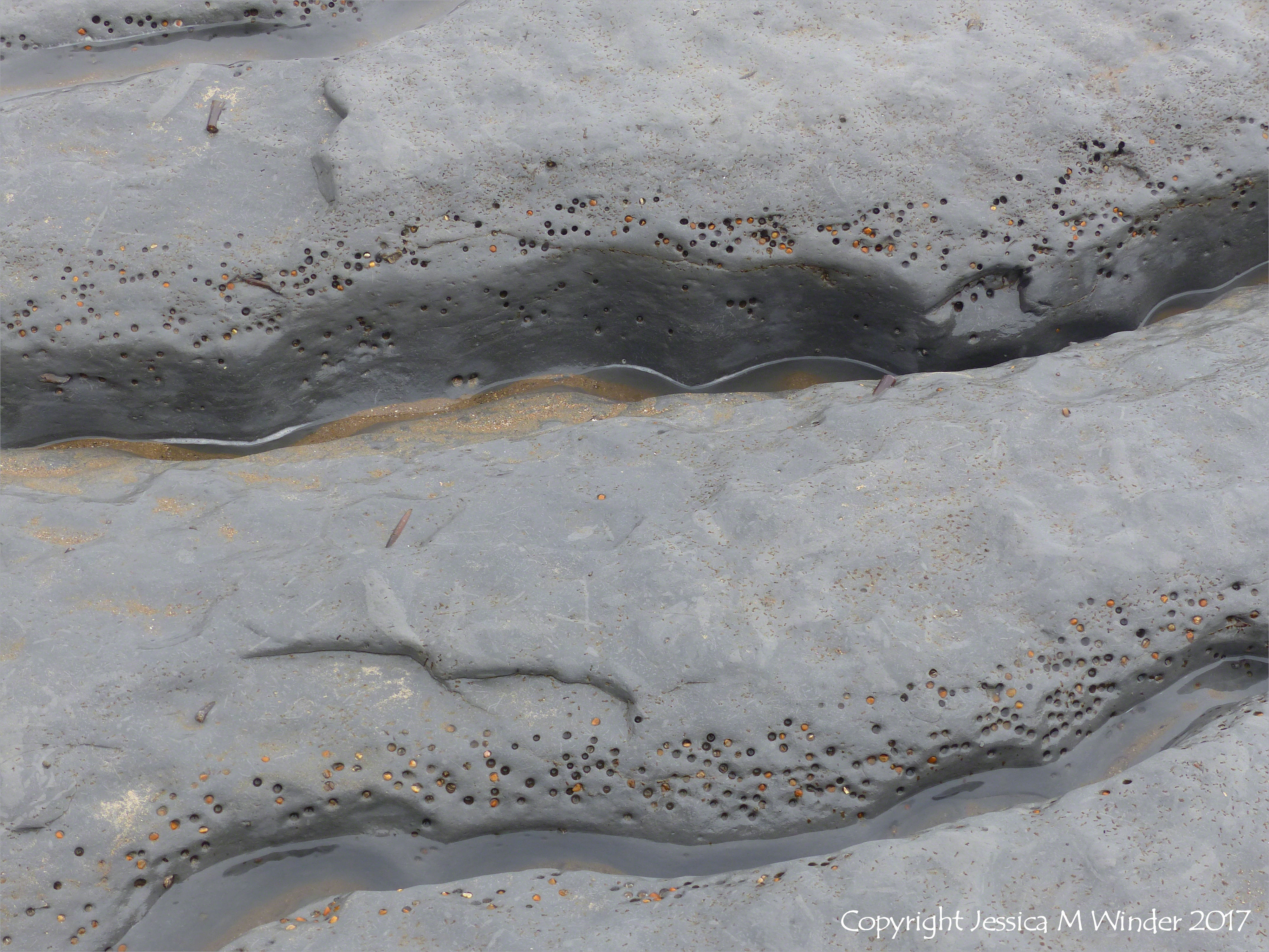 Seatown Rock Piddock Holes 6 – Rounded holes up to 2cm in diameter marking the burrows of the marine bivalve mollusc called the piddock (Pholas dactylus Linnaeus) in calcareous mudstone belonging to the Belemnite Marl Member of the Charmouth Mudstone Formation at Seatown beach in Dorset, England. Much smaller, almost dumbbell-shaped holes frequently occur around the piddock holes, marking the burrows of marine bristleworms such as the as those created by the Polydora species. It is easy to see that rock damage through high levels of burrowing activity by marine organisms like piddocks and bristleworms, can make a significont contribution to coastal erosion.