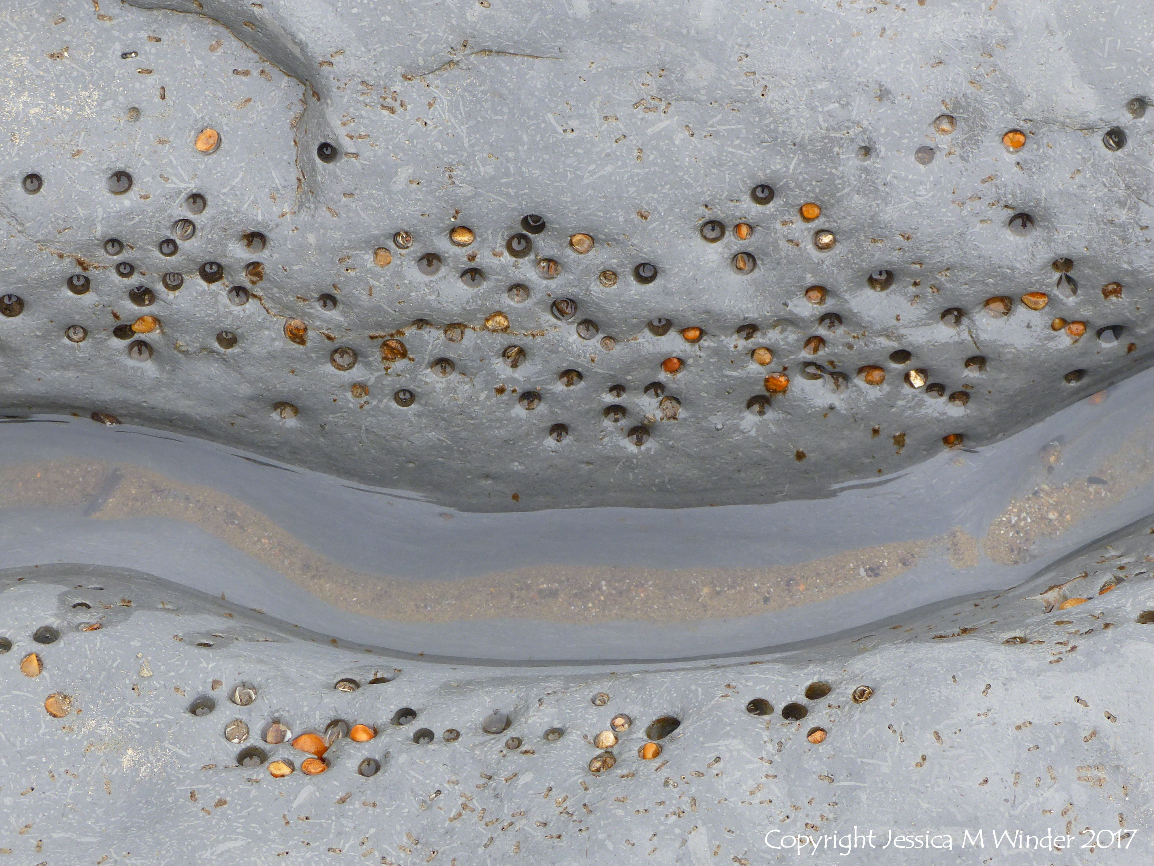 Seatown Rock Piddock Holes 7 – Rounded holes up to 2cm in diameter marking the burrows of the marine bivalve mollusc called the piddock (Pholas dactylus Linnaeus) in calcareous mudstone belonging to the Belemnite Marl Member of the Charmouth Mudstone Formation at Seatown beach in Dorset, England. Much smaller, almost dumbbell-shaped holes frequently occur around the piddock holes, marking the burrows of marine bristleworms such as the as those created by the Polydora species. It is easy to see that rock damage through high levels of burrowing activity by marine organisms like piddocks and bristleworms, can make a significont contribution to coastal erosion.