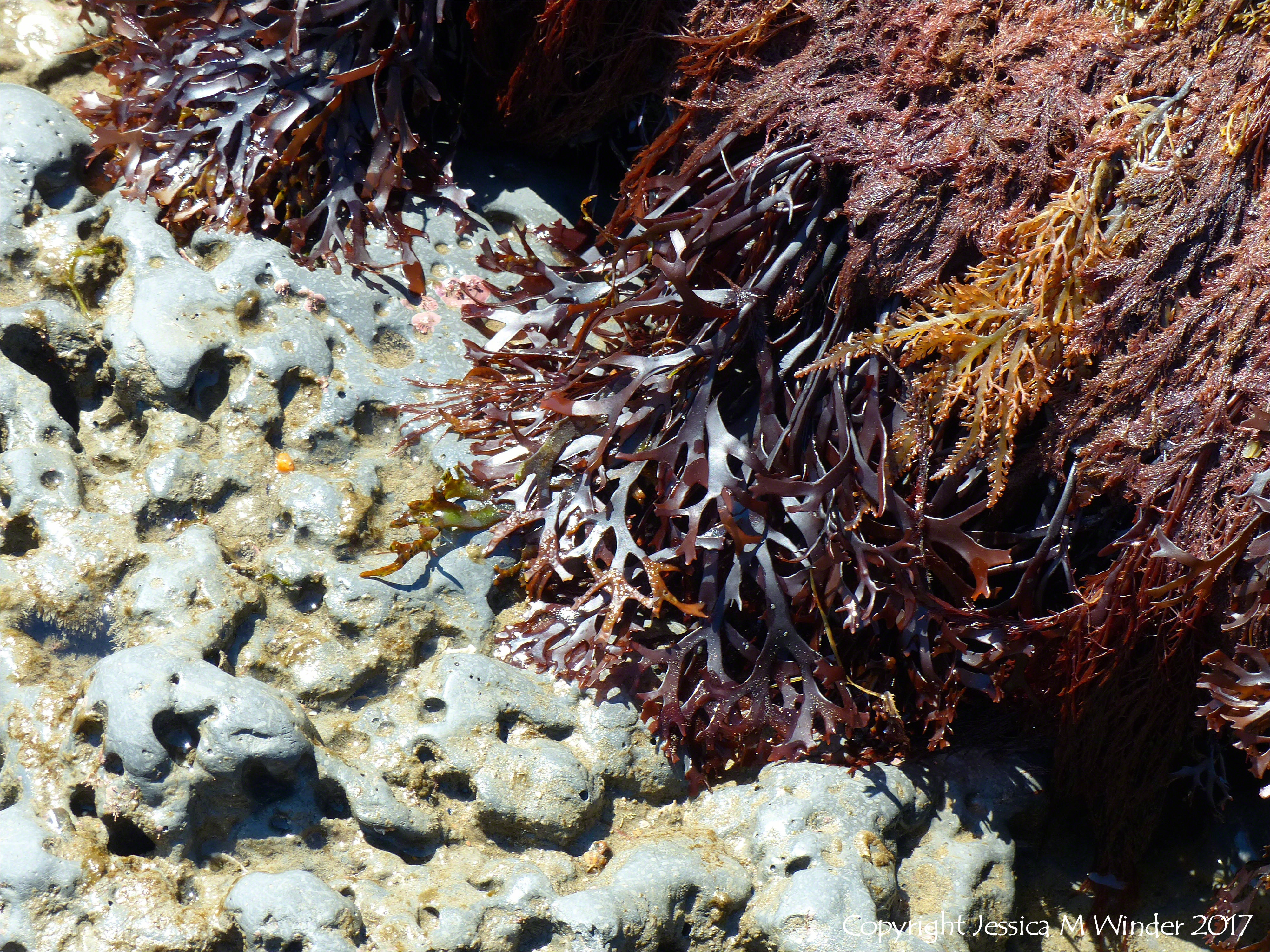 Seatown Rock Piddock Holes 13 – Rounded holes up to 2cm in diameter marking the burrows of the marine bivalve mollusc called the piddock (Pholas dactylus Linnaeus) in calcareous mudstone belonging to the Belemnite Marl Member of the Charmouth Mudstone Formation at Seatown beach in Dorset, England. Much smaller, almost dumbbell-shaped holes frequently occur around the piddock holes, marking the burrows of marine bristleworms such as the as those created by the Polydora species. It is easy to see that rock damage through high levels of burrowing activity by marine organisms like piddocks and bristleworms, can make a significont contribution to coastal erosion.