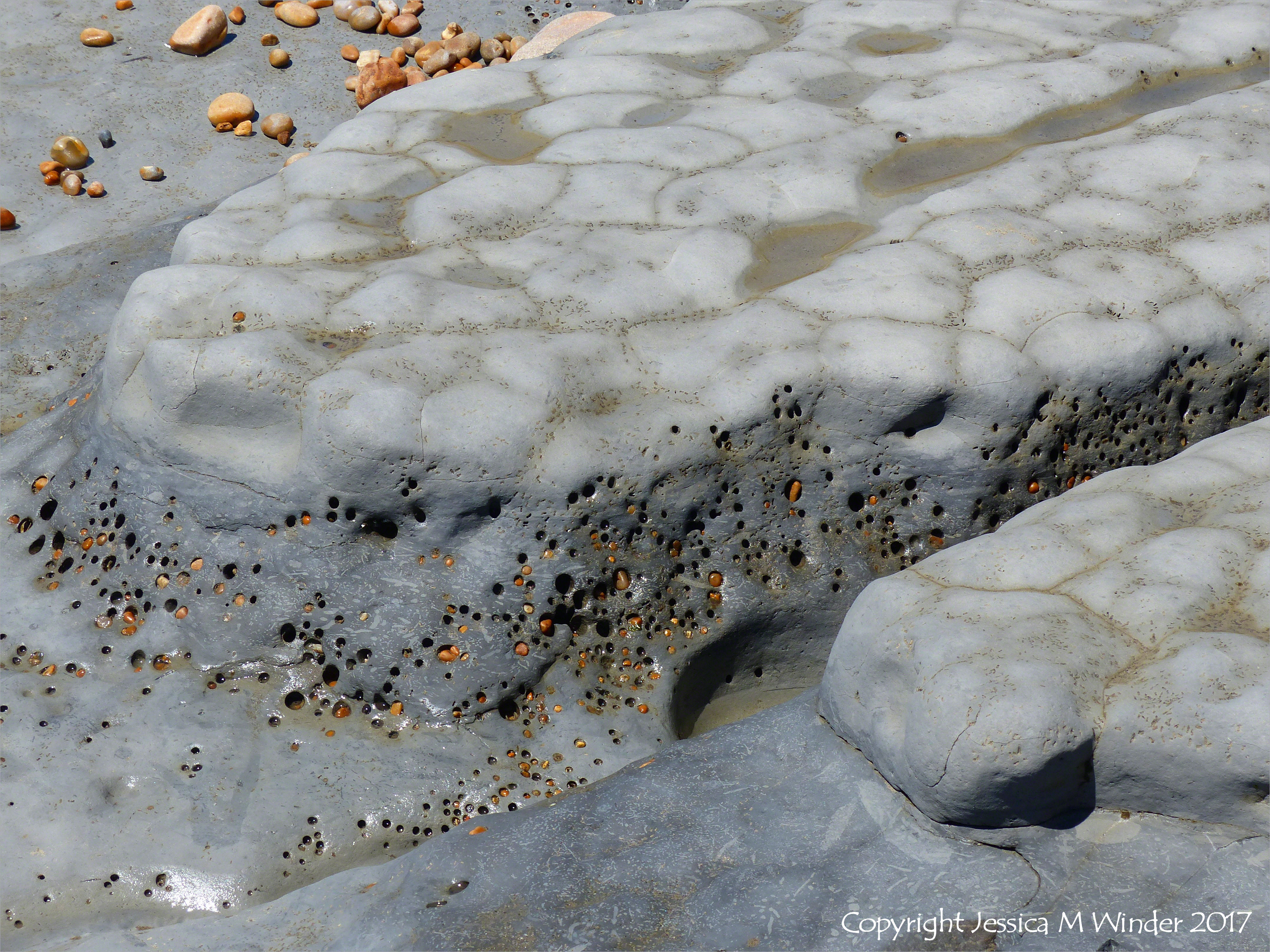 Seatown Rock Piddock Holes 14 – Rounded holes up to 2cm in diameter marking the burrows of the marine bivalve mollusc called the piddock (Pholas dactylus Linnaeus) in calcareous mudstone belonging to the Belemnite Marl Member of the Charmouth Mudstone Formation at Seatown beach in Dorset, England. Much smaller, almost dumbbell-shaped holes frequently occur around the piddock holes, marking the burrows of marine bristleworms such as the as those created by the Polydora species. It is easy to see that rock damage through high levels of burrowing activity by marine organisms like piddocks and bristleworms, can make a significont contribution to coastal erosion.