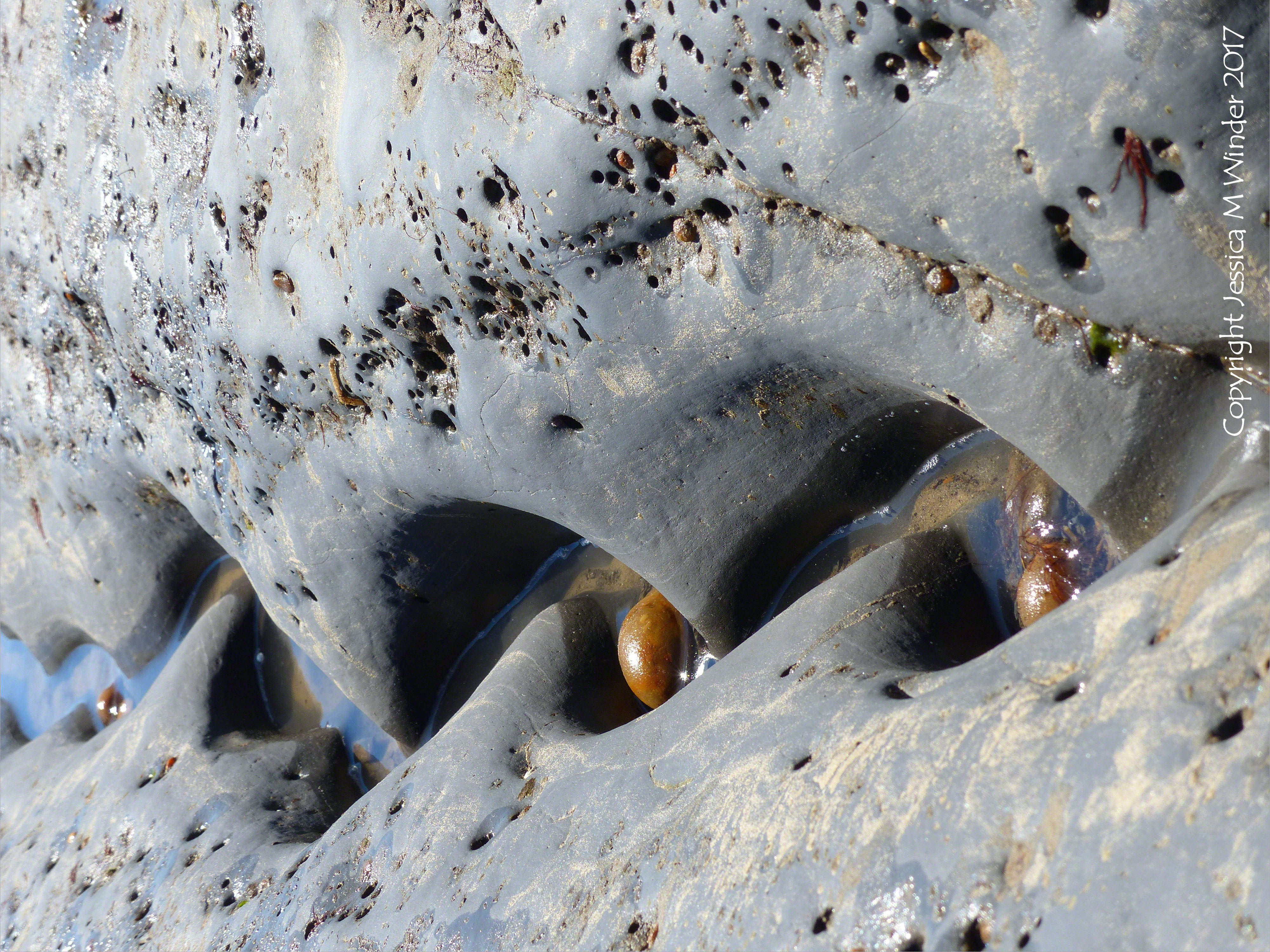 Seatown Rock Piddock Holes 20 – Rounded holes up to 2cm in diameter marking the burrows of the marine bivalve mollusc called the piddock (Pholas dactylus Linnaeus) in calcareous mudstone belonging to the Belemnite Marl Member of the Charmouth Mudstone Formation at Seatown beach in Dorset, England. Much smaller, almost dumbbell-shaped holes frequently occur around the piddock holes, marking the burrows of marine bristleworms such as the as those created by the Polydora species. It is easy to see that rock damage through high levels of burrowing activity by marine organisms like piddocks and bristleworms, can make a significont contribution to coastal erosion.