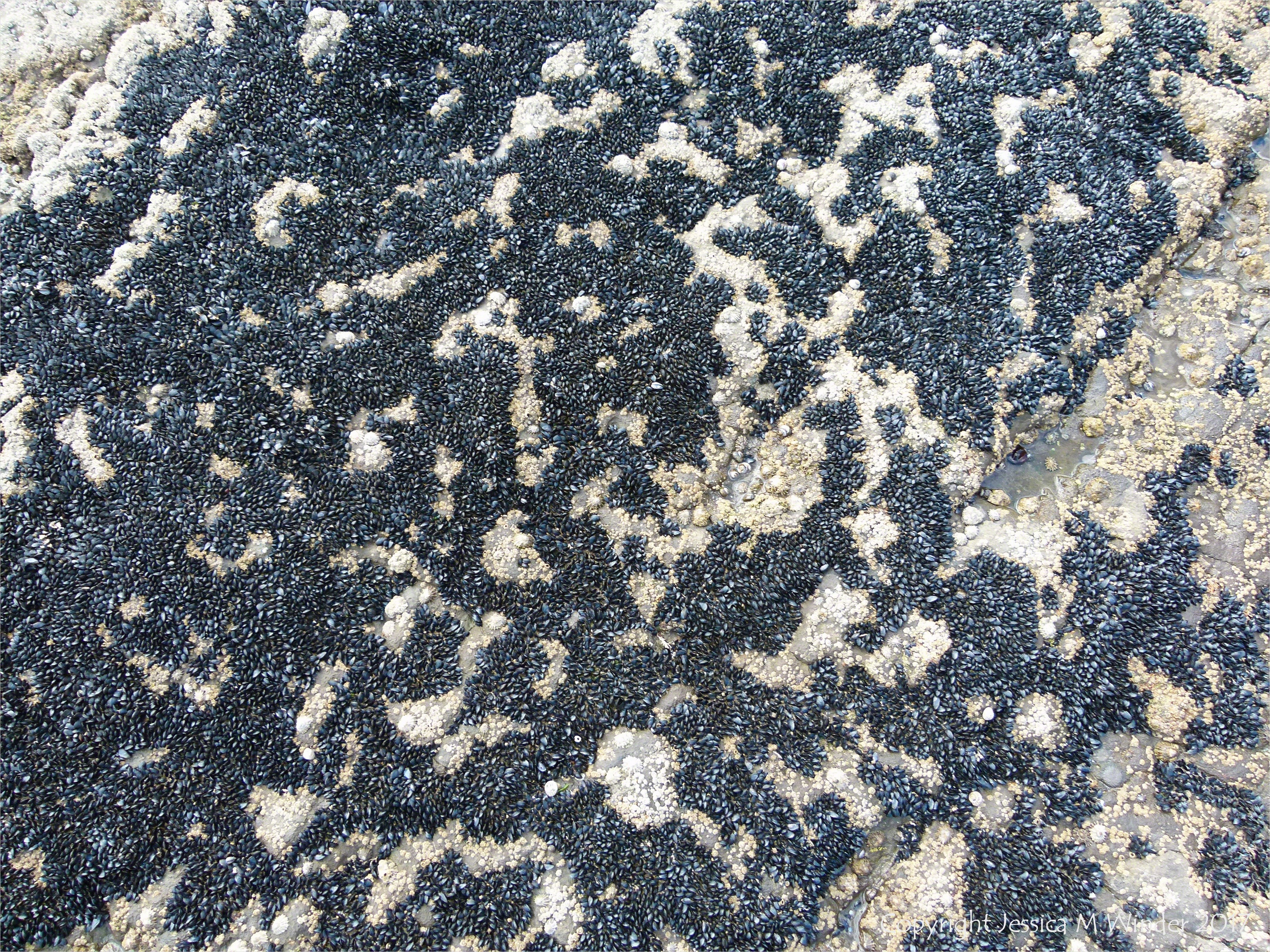 On the Rocks at Fall Bay 8 – Mussels, limpets, and barnacles growing on limestone, high in the intertidal zone, at Fall Bay, Gower, South Wales.
