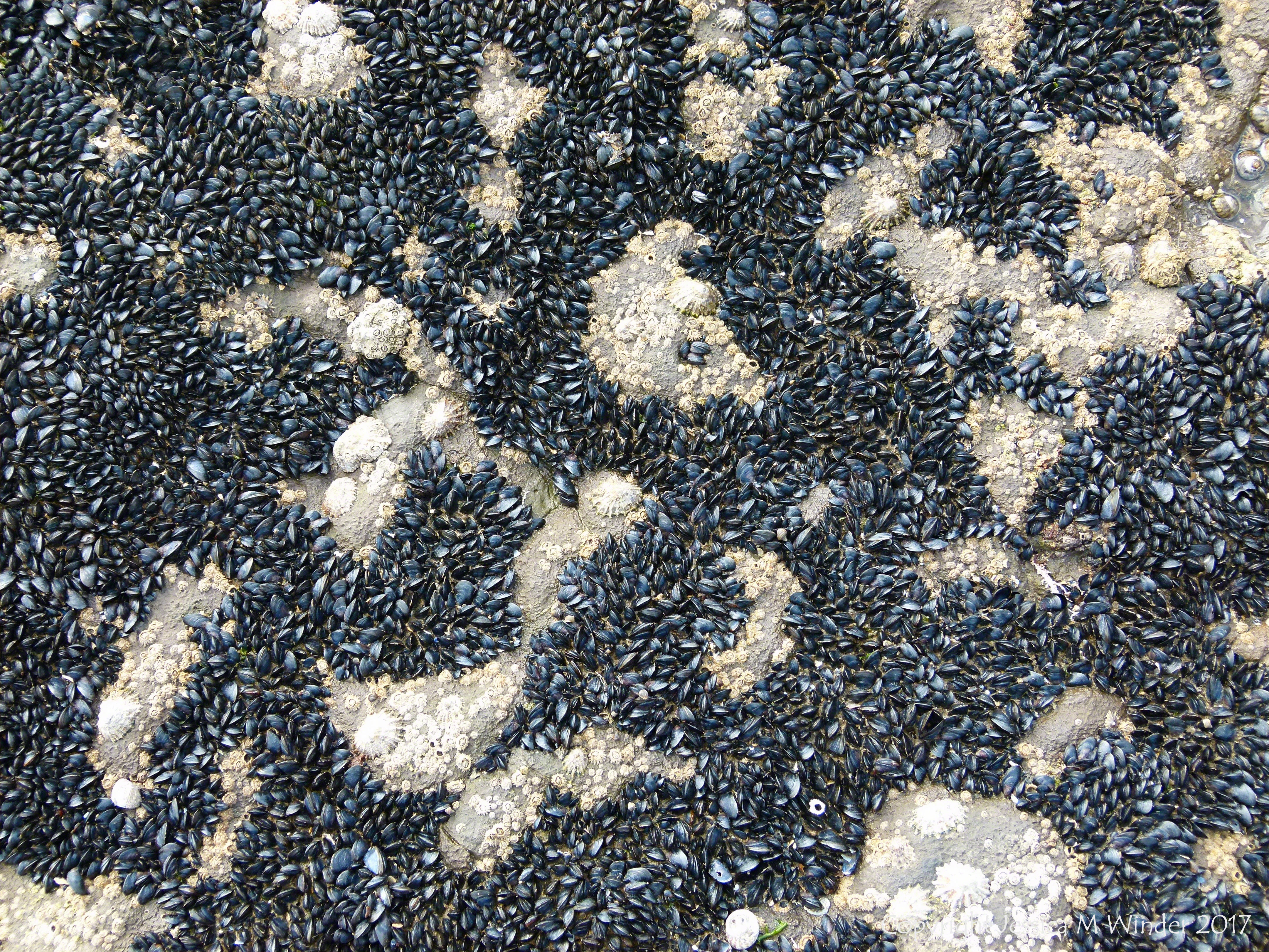 On the Rocks at Fall Bay 7 – Mussels, limpets, and barnacles growing on limestone, high in the intertidal zone, at Fall Bay, Gower, South Wales.