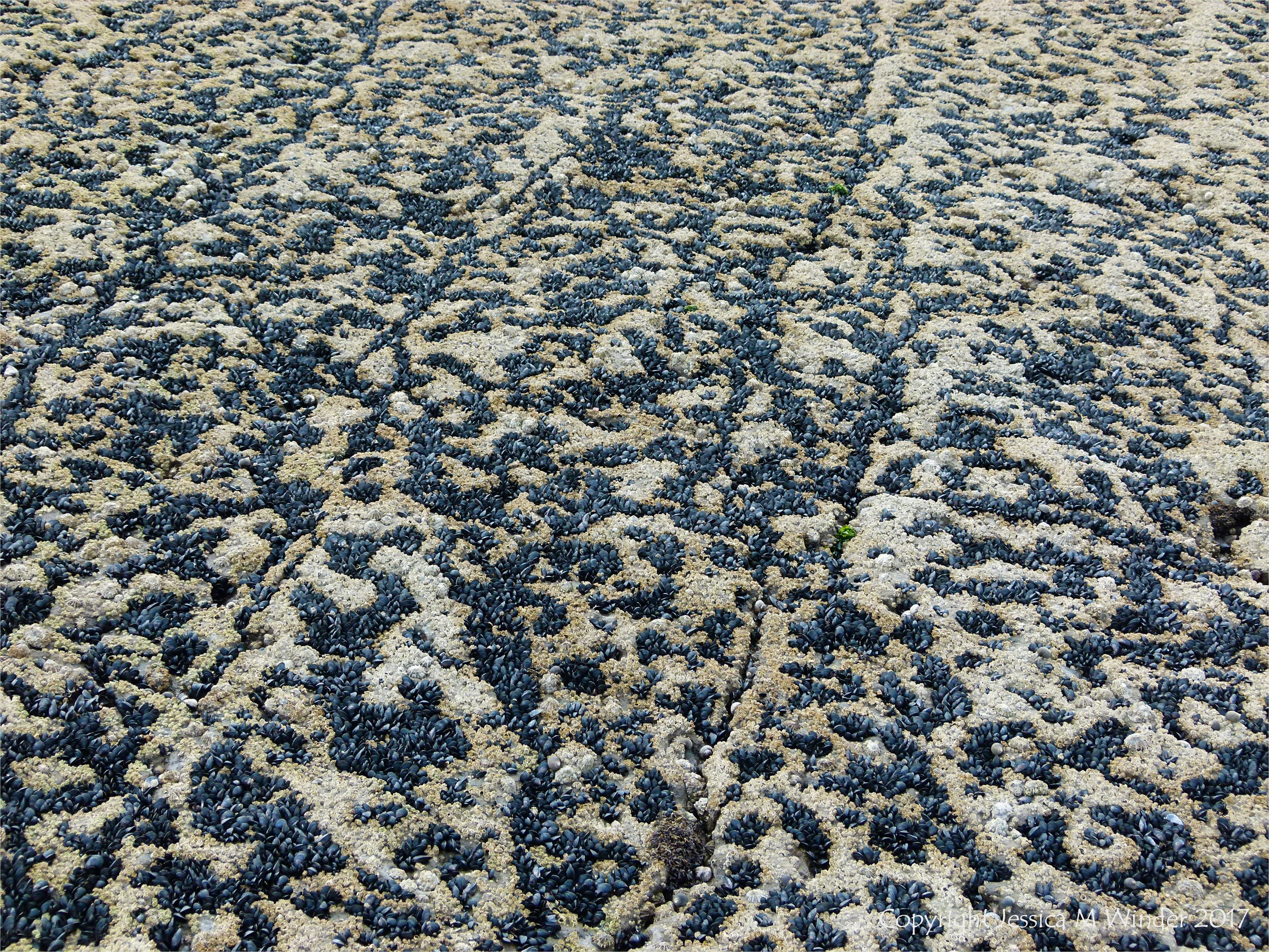 On the Rocks at Fall Bay 6 – Mussels, limpets, and barnacles growing on limestone, high in the intertidal zone, at Fall Bay, Gower, South Wales.