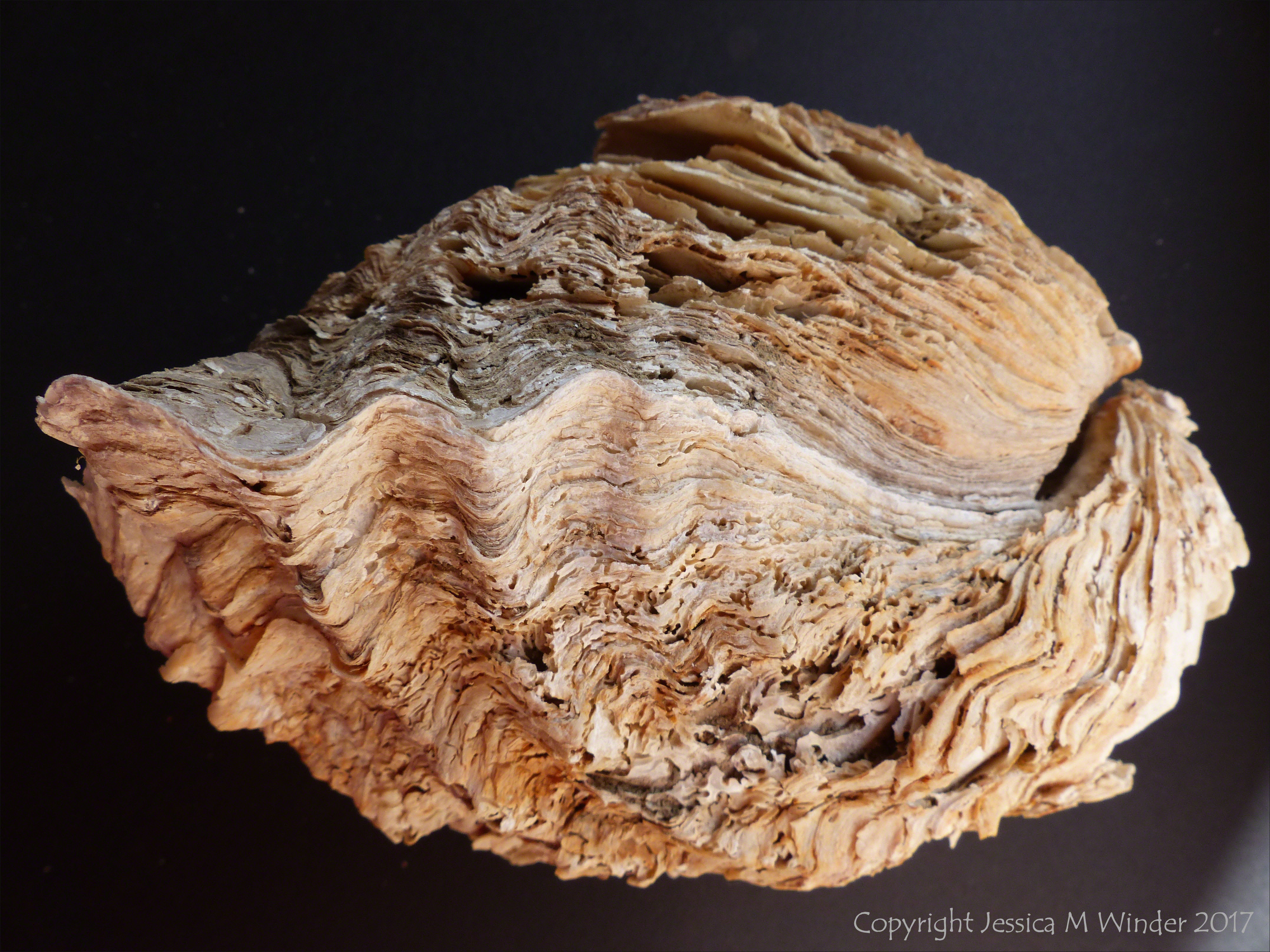 Thick Shell of Crassostrea gigas 6 – Oyster shell specimen dredged in 1987 with abnormal thickening possibly due to the chemical TBT from anti-fouling paints in the water at Poole Harbour, Dorset, England.