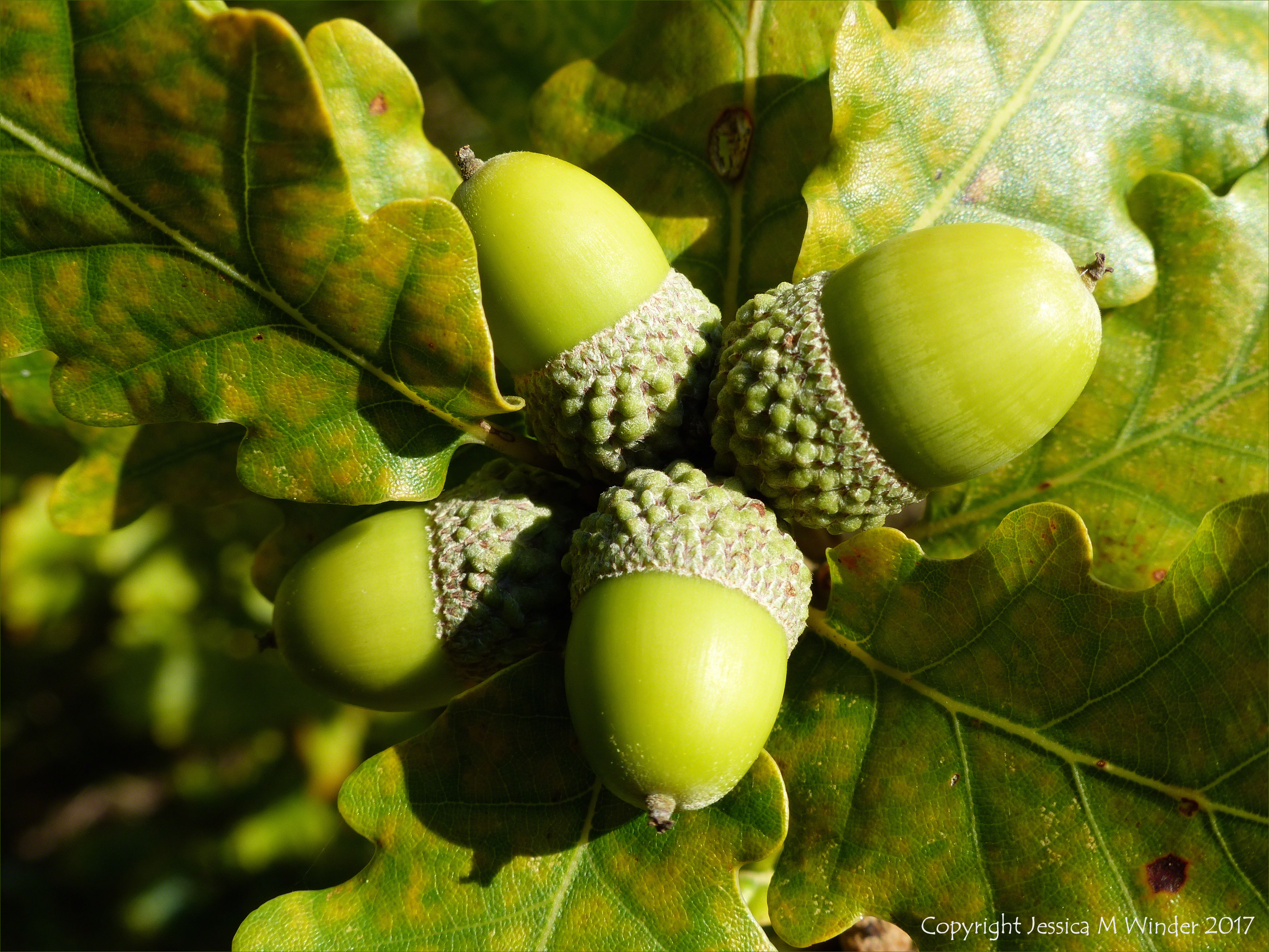 Hint of Autumn 1 – Fat green acorns in their cups on the tree with just a suggestion that the leaves are changing colour for autumn. Photographed at Kenwood House Gardens in London 12 September 2017.