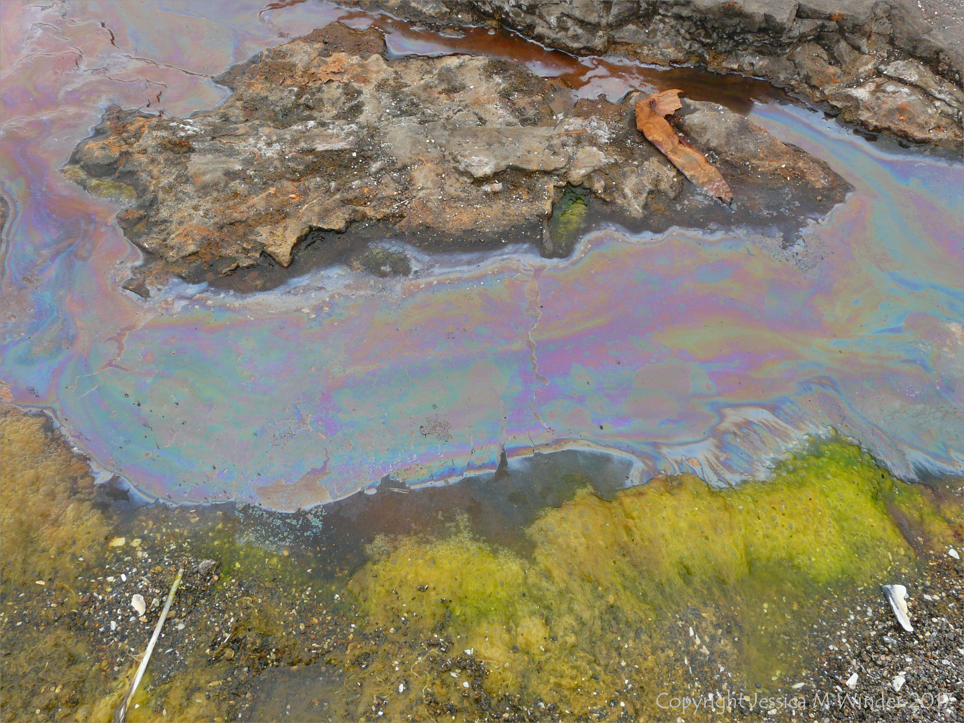 Iridescent Bacterial Film 3 – Natural abstract pattern in rainbow colours on the surface of water produced by iron-oxidising bacteria in a small beach stream issuing from iron-rich volcanic rocks at Yachats in Oregon, USA. Iron-rich volcanic rock, and green algae with bubbles of oxygen, border the iridescent film.