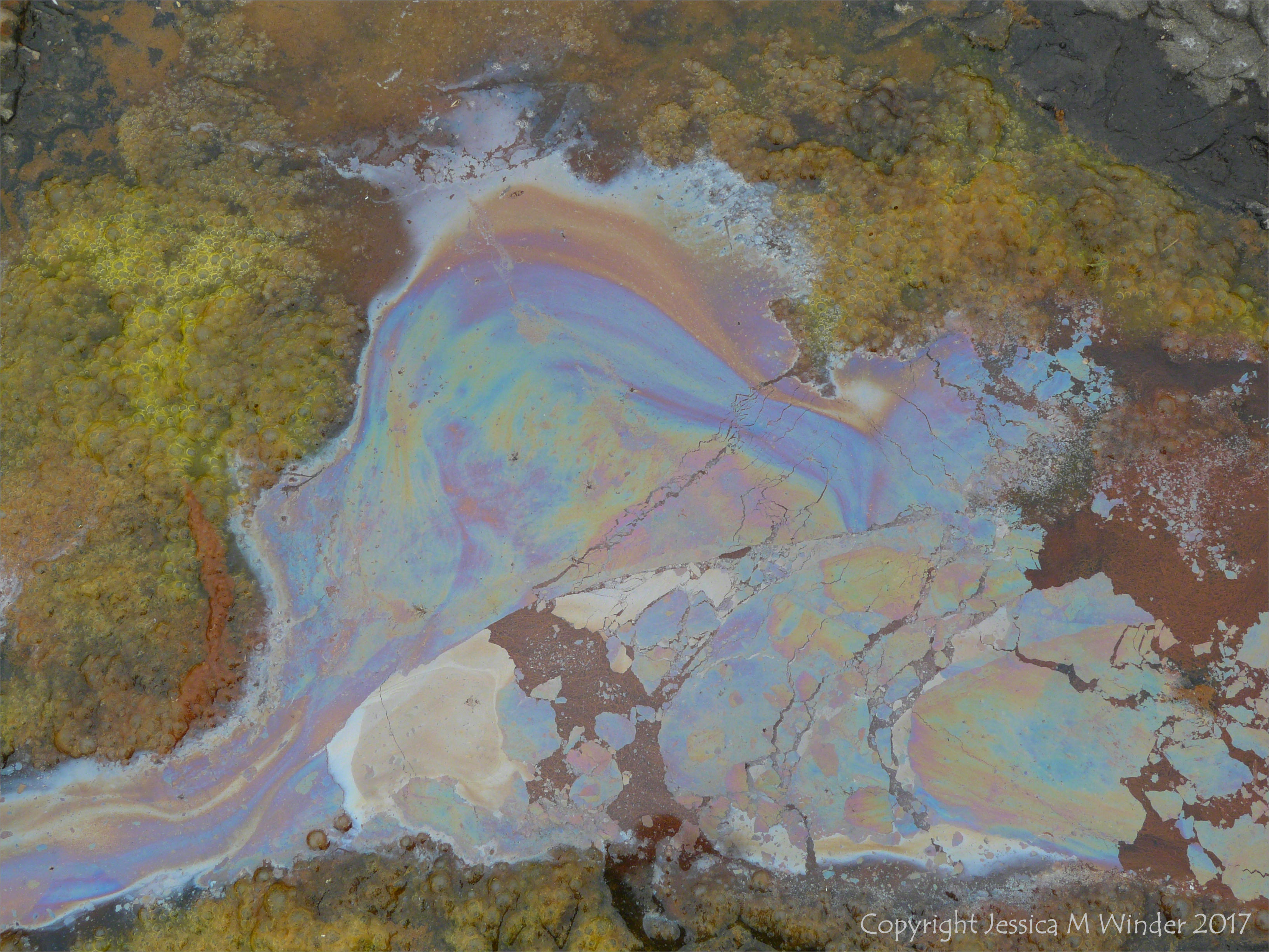 Iridescent Bacterial Film 8 – Natural abstract pattern in rainbow colours on the surface of water produced by iron-oxidising bacteria in a small beach stream issuing from iron-rich volcanic rocks at Yachats in Oregon, USA. Algae producing oxygen bubbles and partially coated with iron deposits from bacterial activity border the iridescent film.