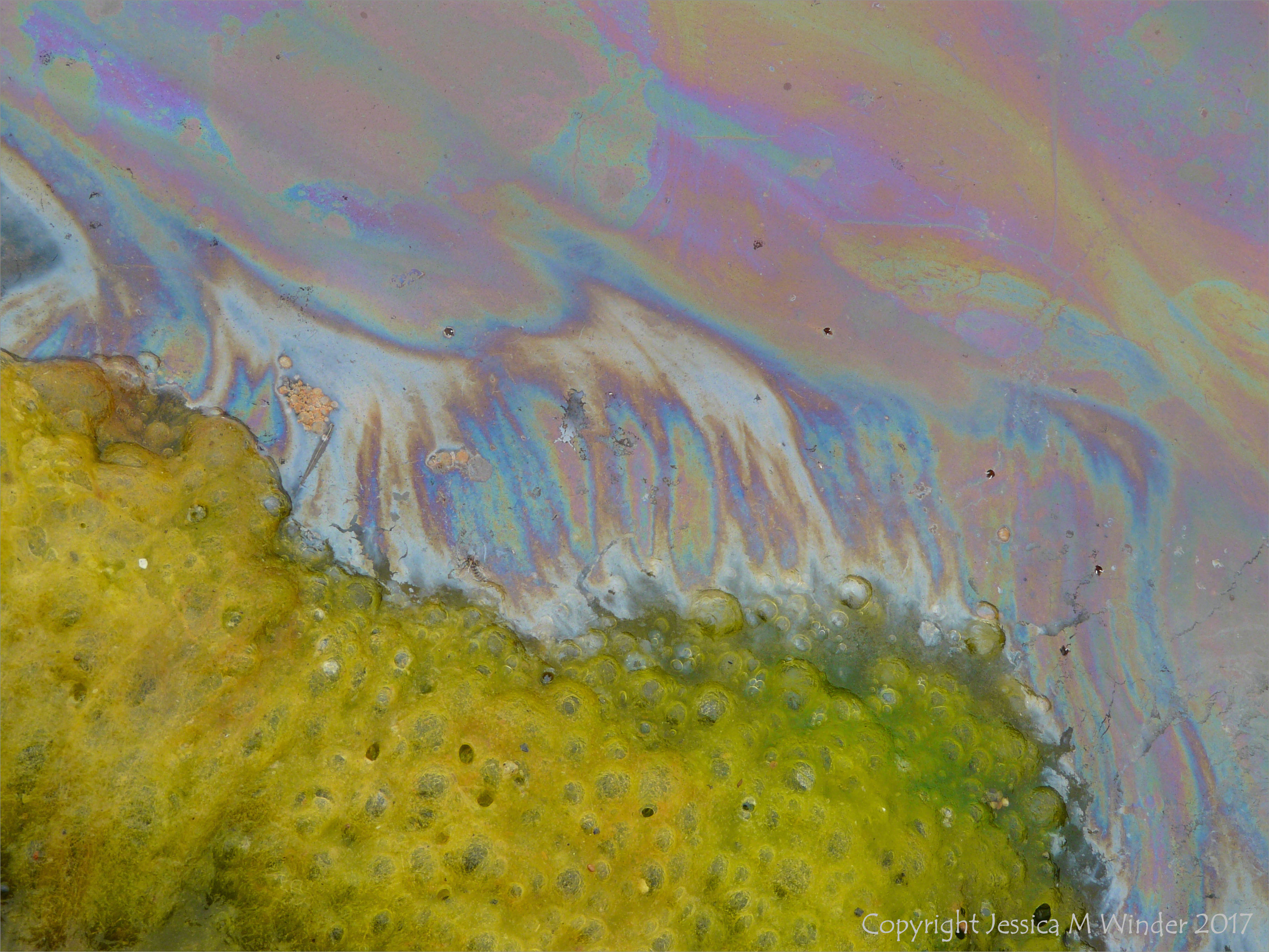 Iridescent Bacterial Film 1 – Natural abstract pattern in rainbow colours on the surface of water produced by iron-oxidising bacteria in a small beach stream issuing from iron-rich volcanic rocks at Yachats in Oregon, USA. Green algae with bubbles of oxygen border the iridescent film.