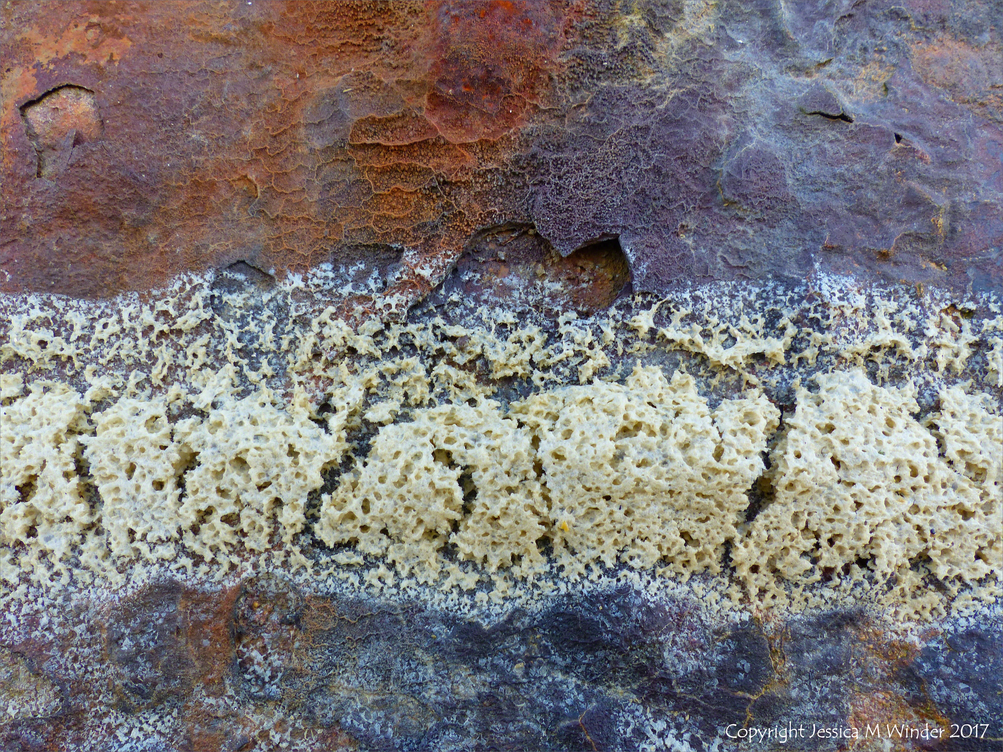 Seafoam Tidemark on Rusty Iron 5 – Natural pattern, texture, and contrasting colours of creamy lace-like dried sea foam tide-marks, and green algae, on the multi-coloured rusty iron of a seaside pier at Weymouth in Dorset, UK.
