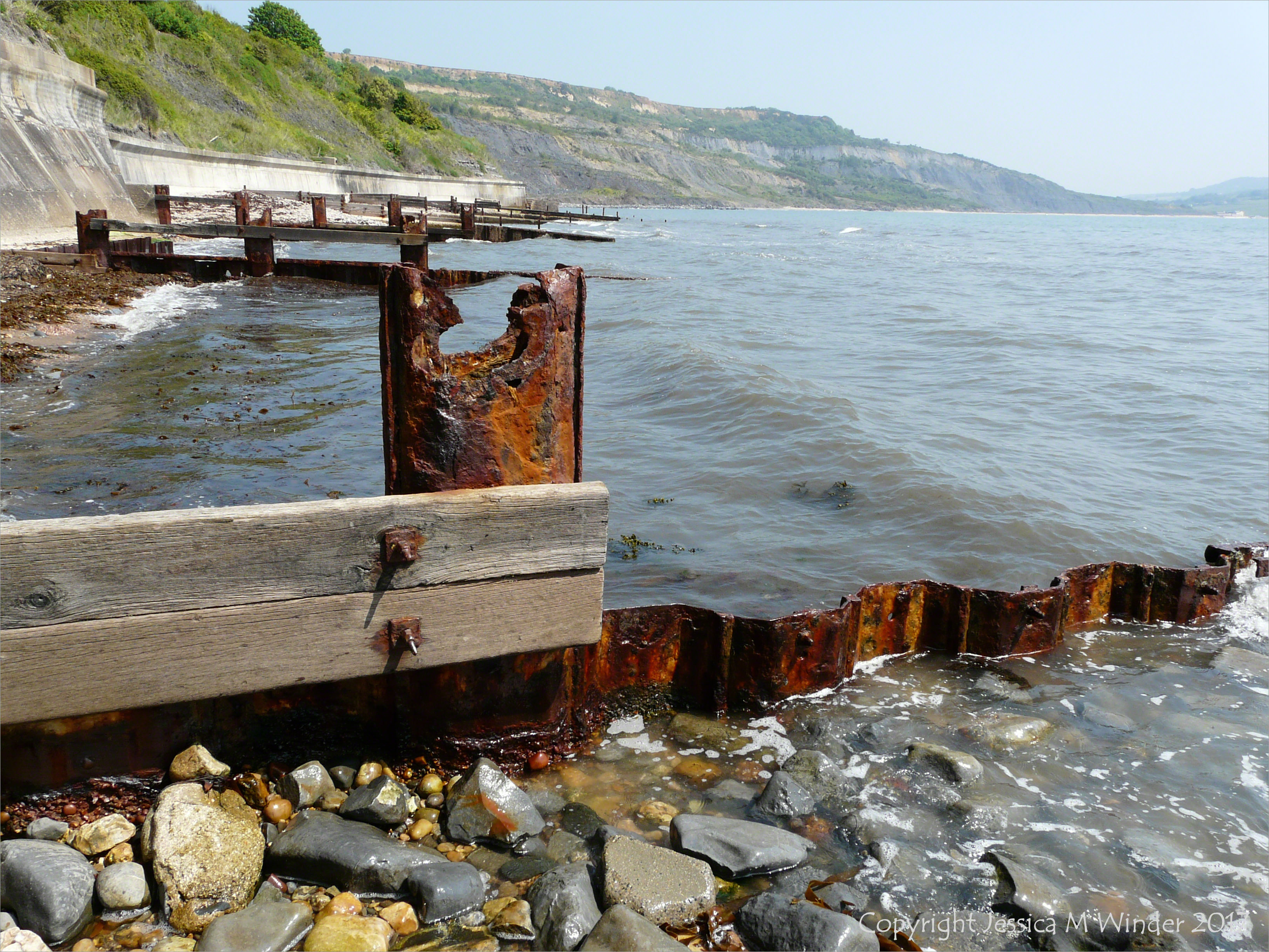 Old Breakwater at Church Cliff 3 – Old wooden breakwaters with rusty iron fittings on the sea shore at Church Cliff, Lyme Regis, Dorset June 2010.