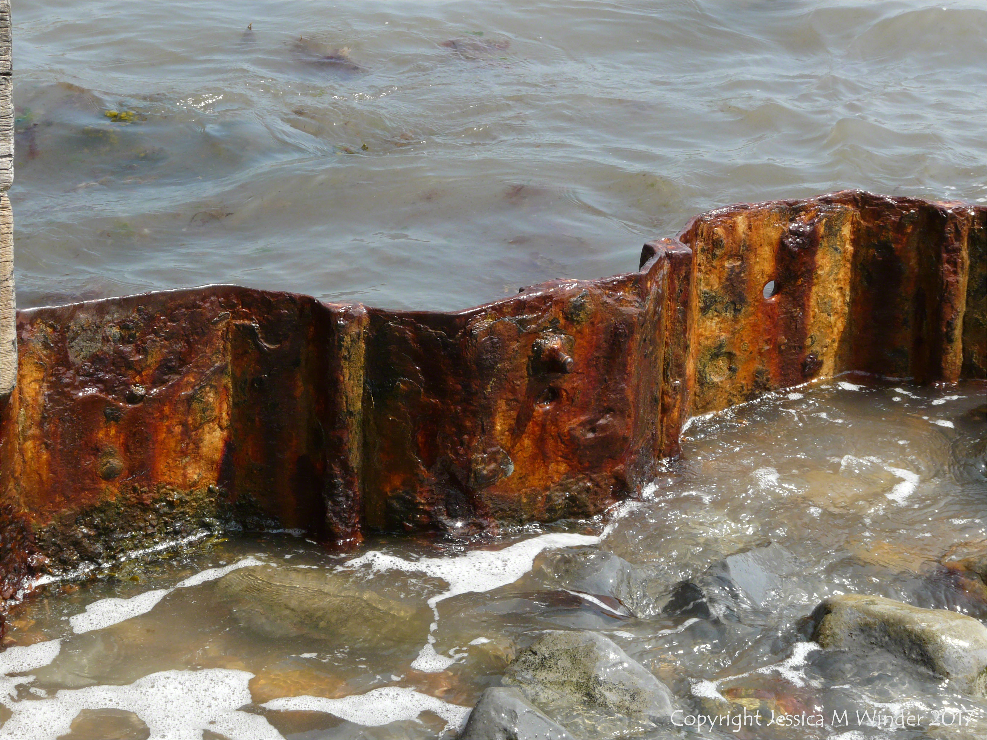 Old Breakwater at Church Cliff 4 – Rusty iron fittings on the sea shore from an old wooden breakwater at Church Cliff, Lyme Regis, Dorset, June 2010.