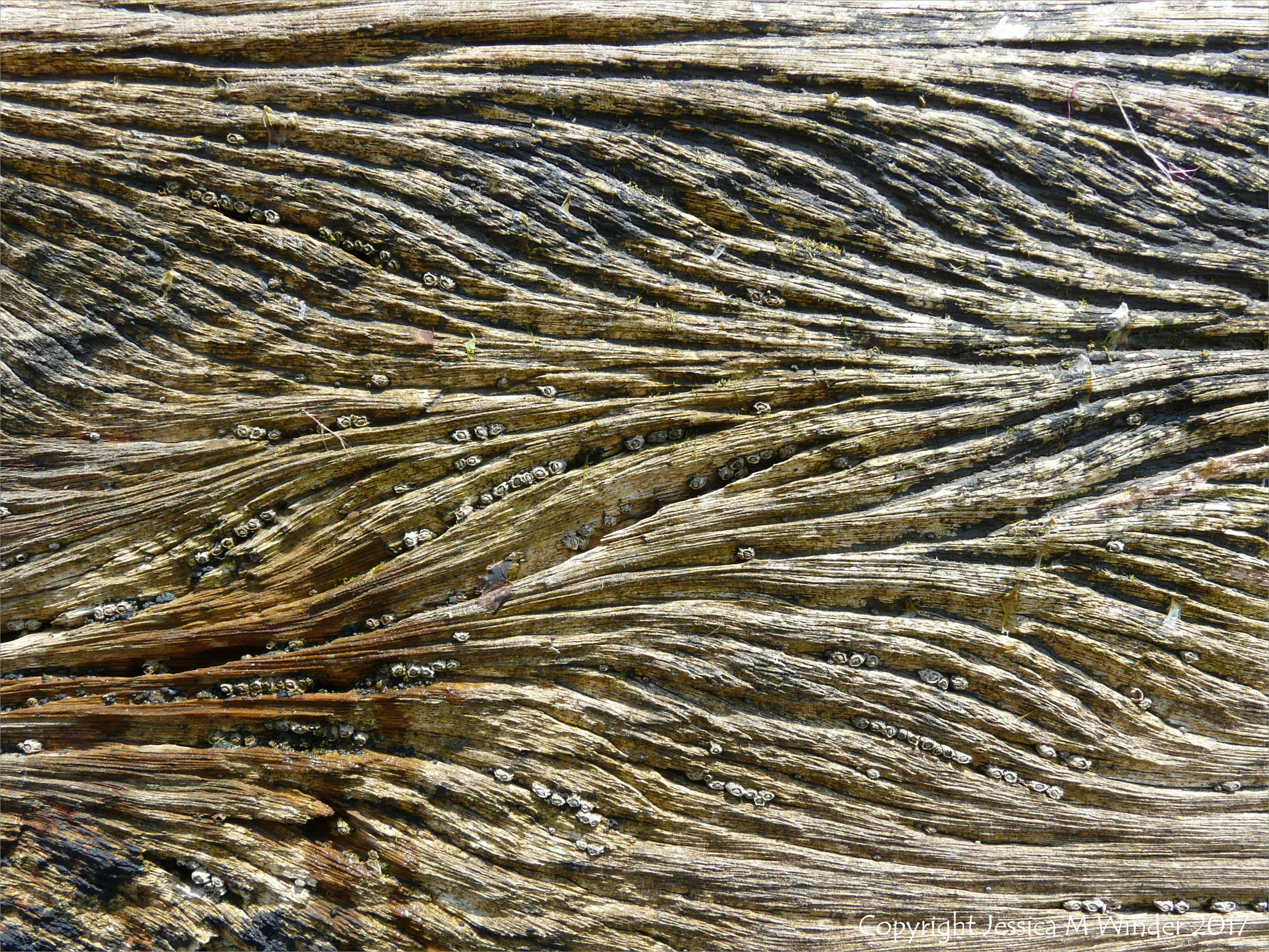 Woodgrain On OCC Breakwaters 6 – Close-up of curvilinear wave-like woodgrain patterns in old wooden breakwaters (now demolished) at Church Cliff, Lyme Regis, Dorset, UK, June 2010.