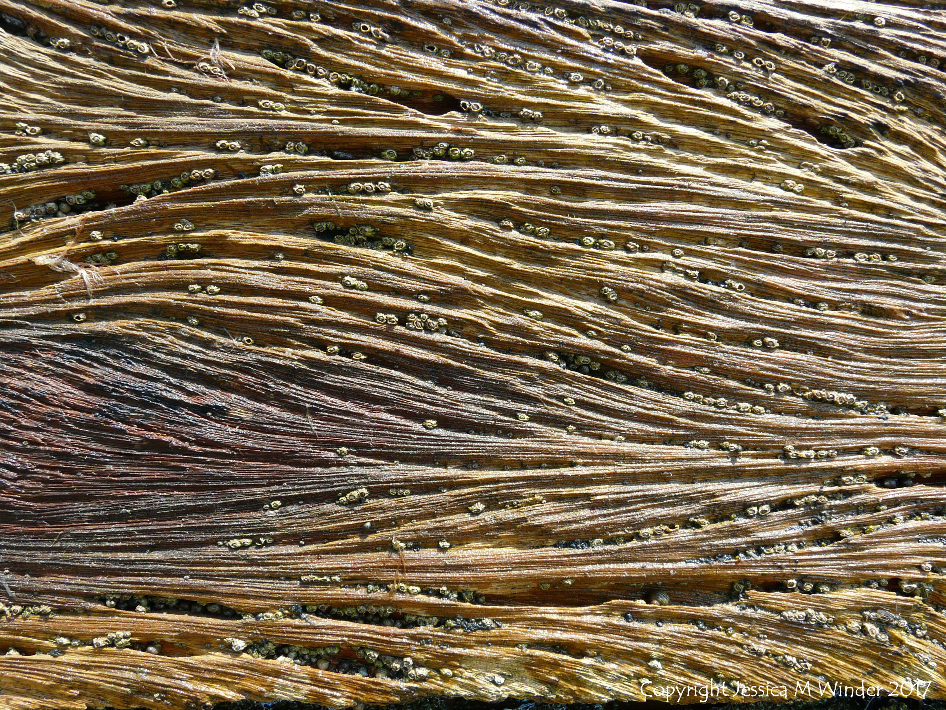 Woodgrain On OCC Breakwaters 11 – Close-up of curvilinear wave-like woodgrain patterns in old wooden breakwaters (now demolished) at Church Cliff, Lyme Regis, Dorset, UK, June 2010. Barnacles, gastropods and black lichen are living in the grooves.