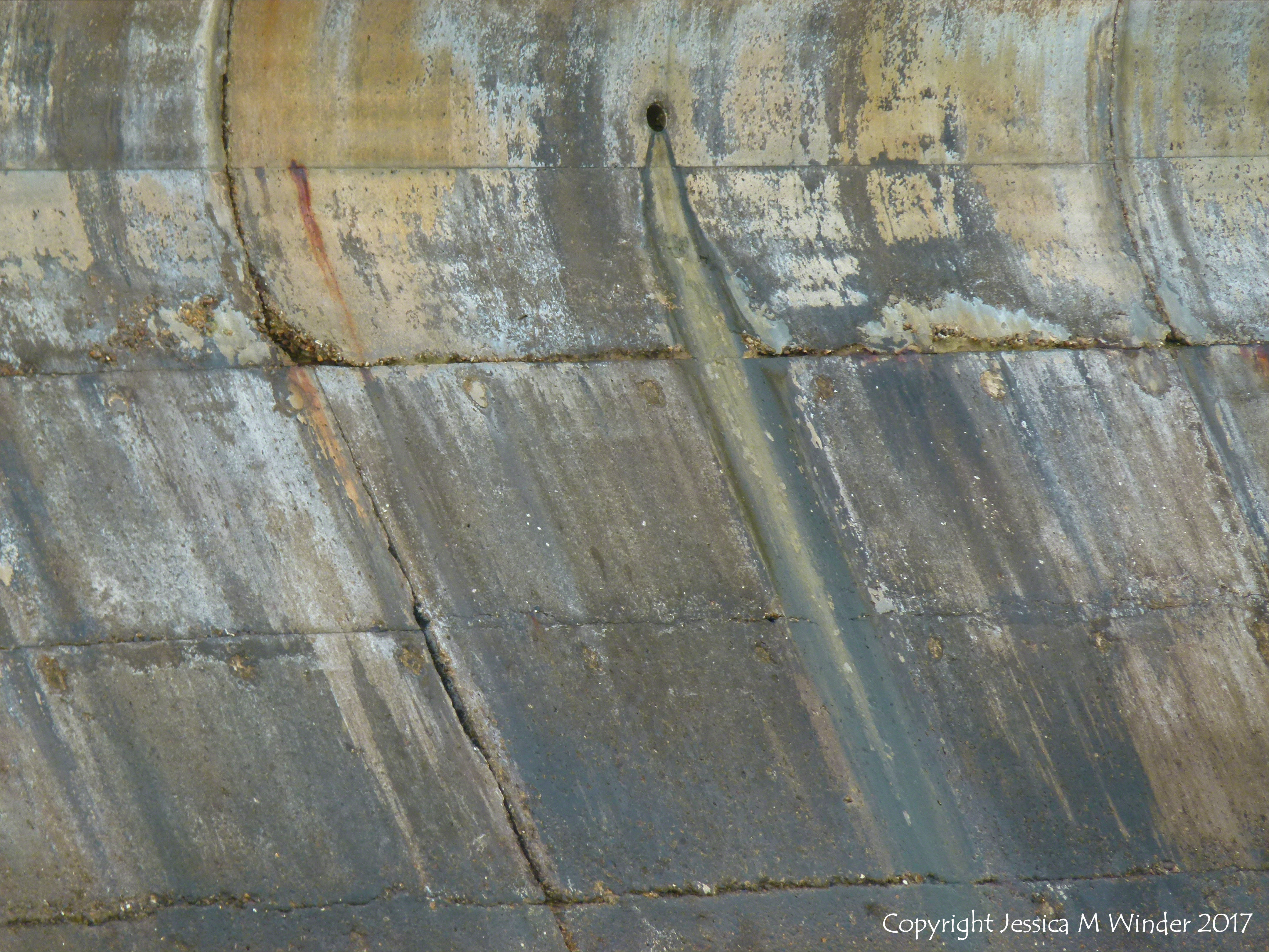 Old Sea Wall Church Cliff 2 – Detail of a sea defence system of a concrete sea wall, with natural pattern of staining by groundwater run-off from above, bacterial action, and lichen, as it looked in February 2011 at Church Cliff in Lyme Regis, Dorset, on the World Heritage Site of the Jurassic Coast.
