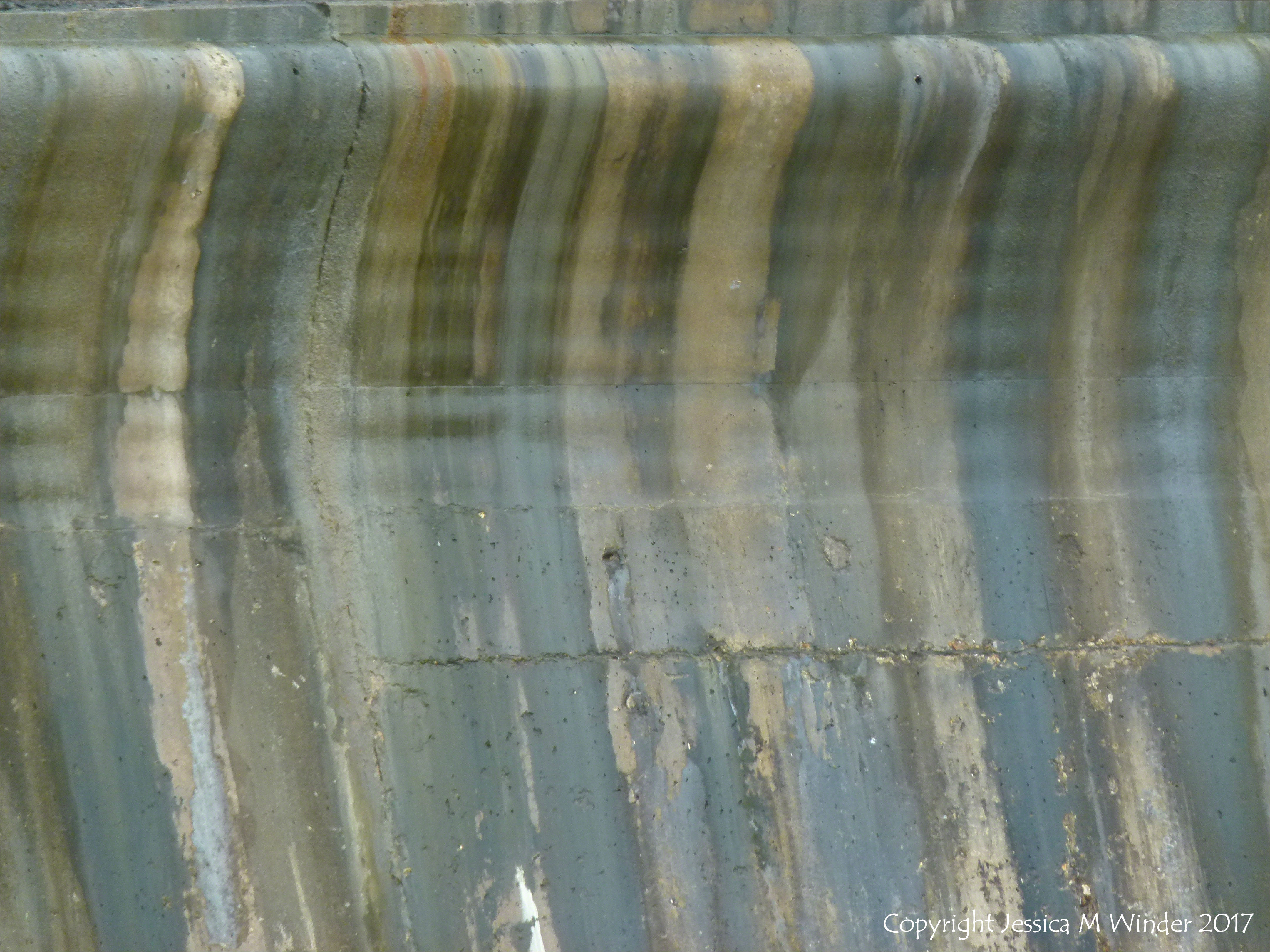 Old Sea Wall Church Cliff 7 – Detail of a sea defence system of a concrete sea wall, with natural pattern of staining by groundwater run-off from above, bacterial action, and lichen, as it looked in February 2011 at Church Cliff in Lyme Regis, Dorset, on the World Heritage Site of the Jurassic Coast.