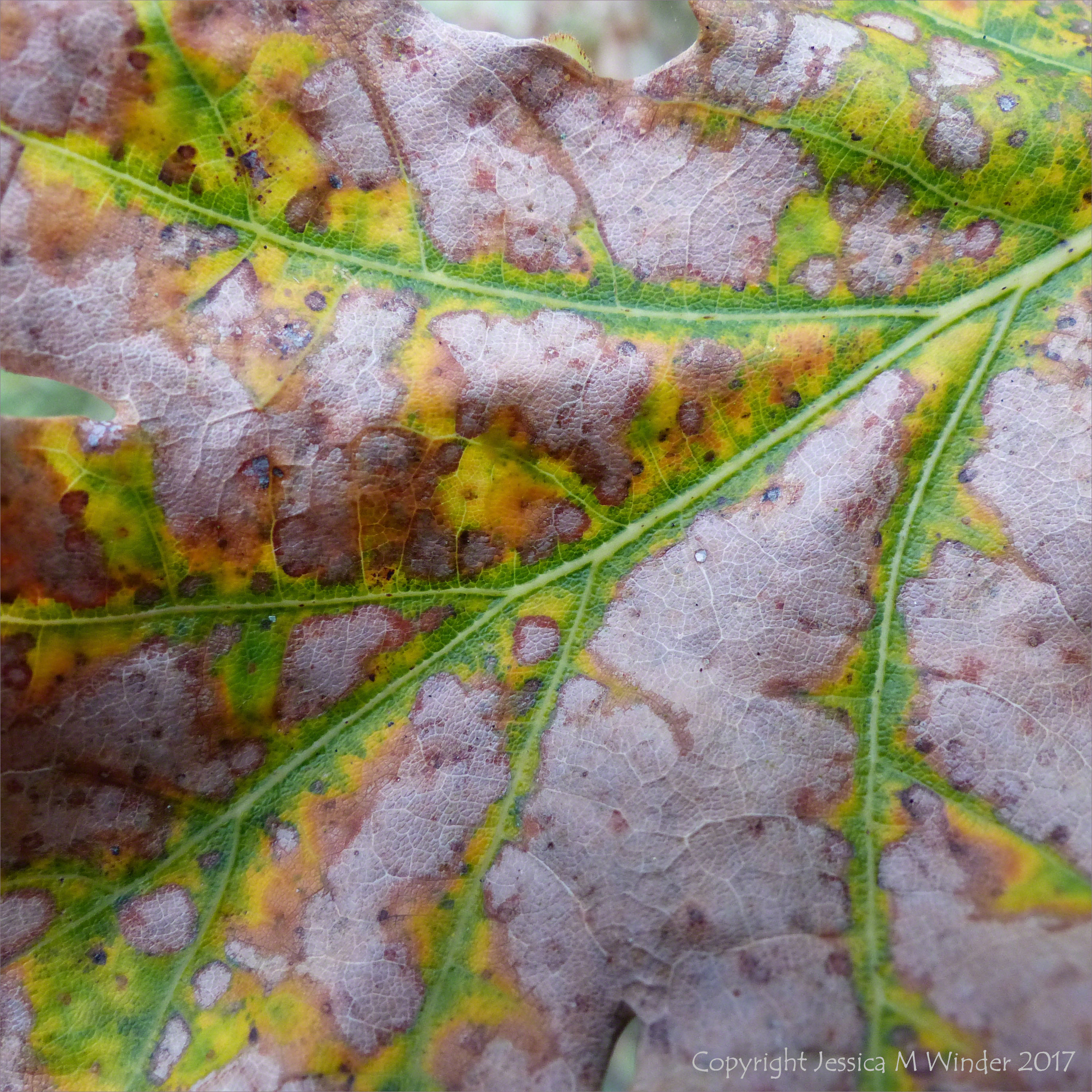 Dismal Autumn Day In Charlton Down 14 – Close-up of leaf pattern with changing colour in an autumnal oak leaf in the community meadow at Charlton Down in Dorset, England, 9 October 2017.