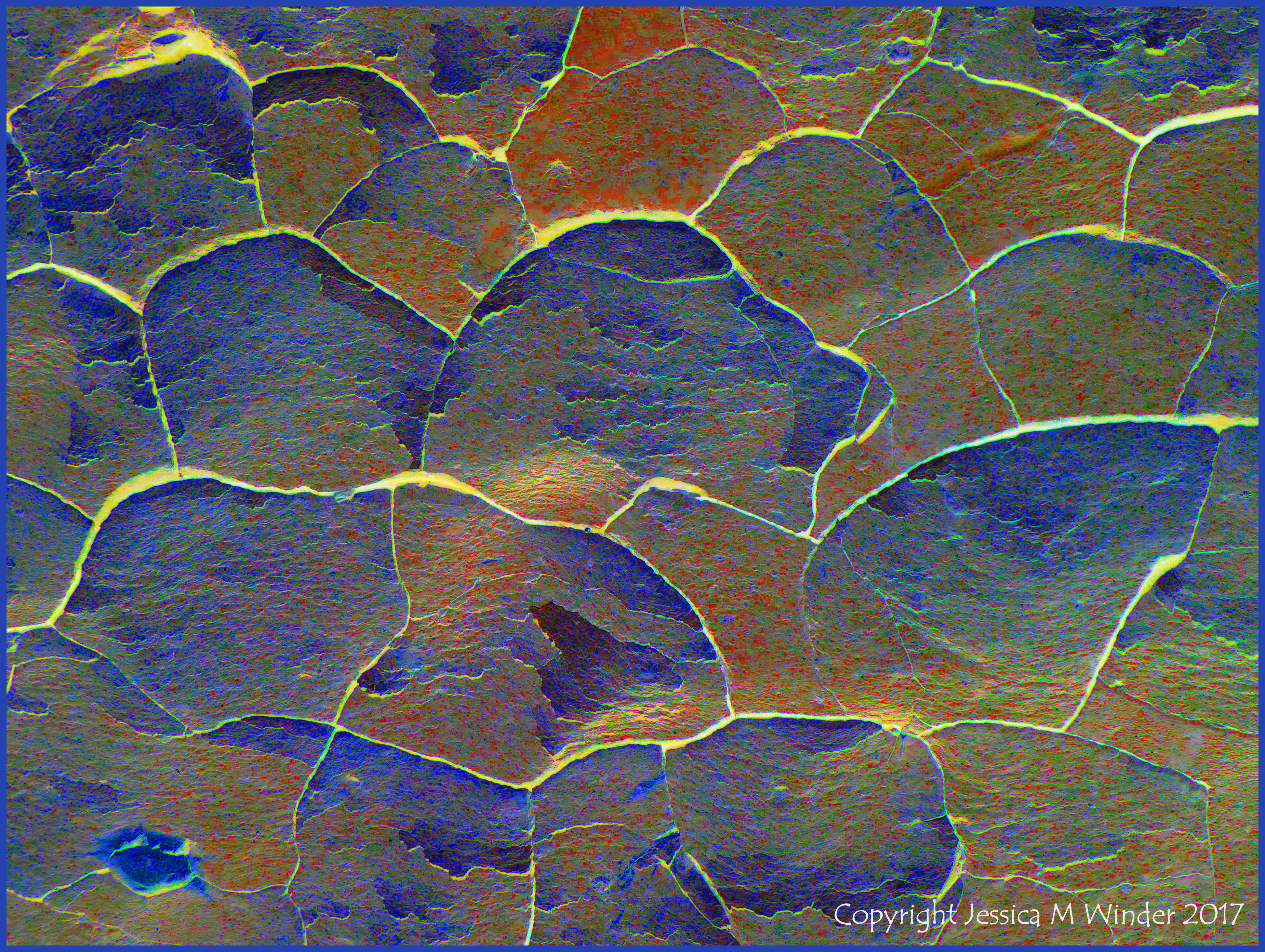 Fractured 10 – Abstract image based on natural fracture patterns in soft Jurassic rocks at Seatown in Dorset, England, a digitally re-coloured photograph. Perhaps dessication cracks rather than fractures.