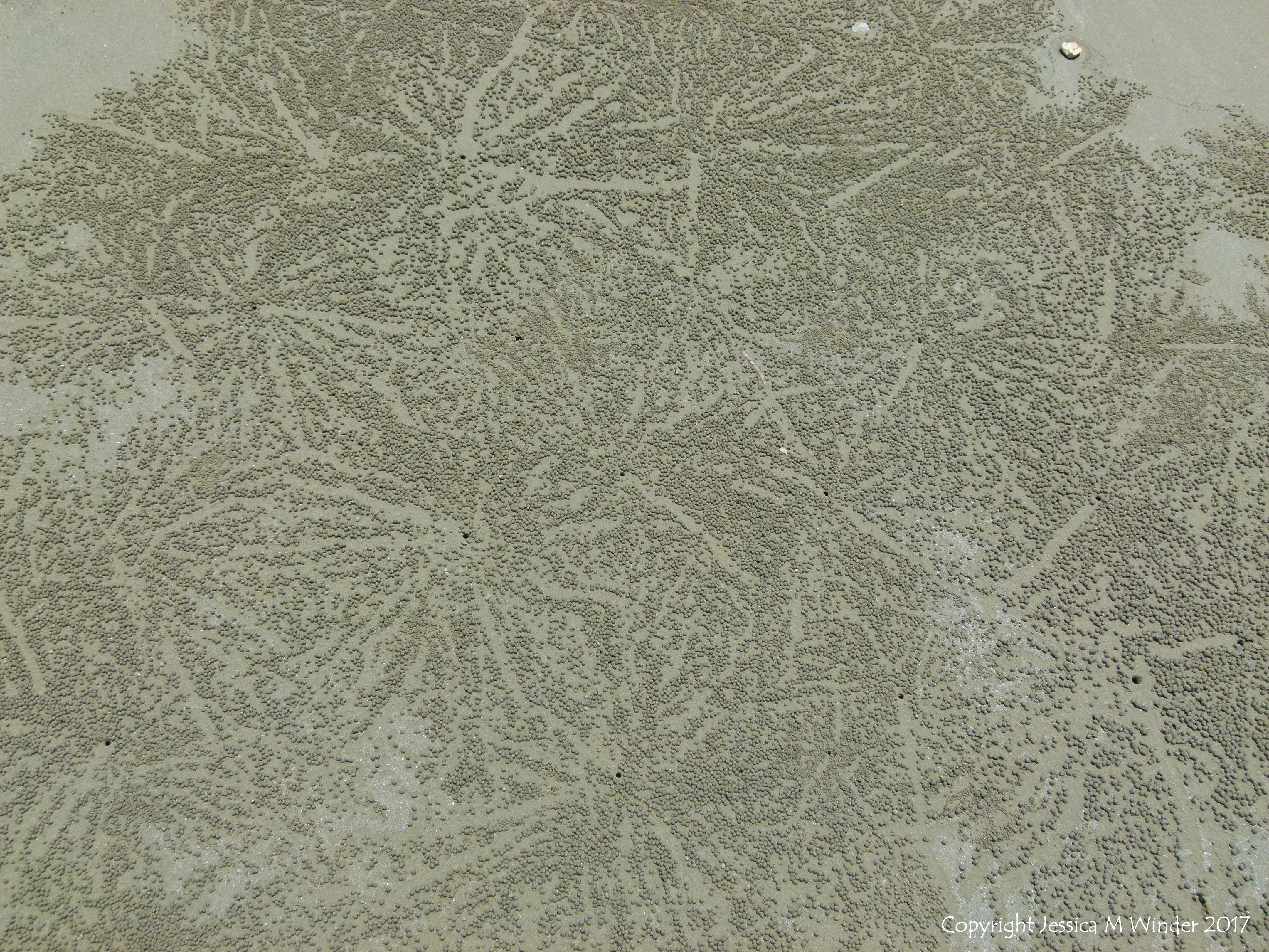 Sand Bubbler Crabs at Cape Tribulation 1 – Small ball-shaped sand pellets produced by the feeding activities of the Sand Bubbler Crab (Scopimera sp.) on the beach at Cape Tribulation in Queensland, Australia. Radiating lines of sandy balls surround each crab burrow.