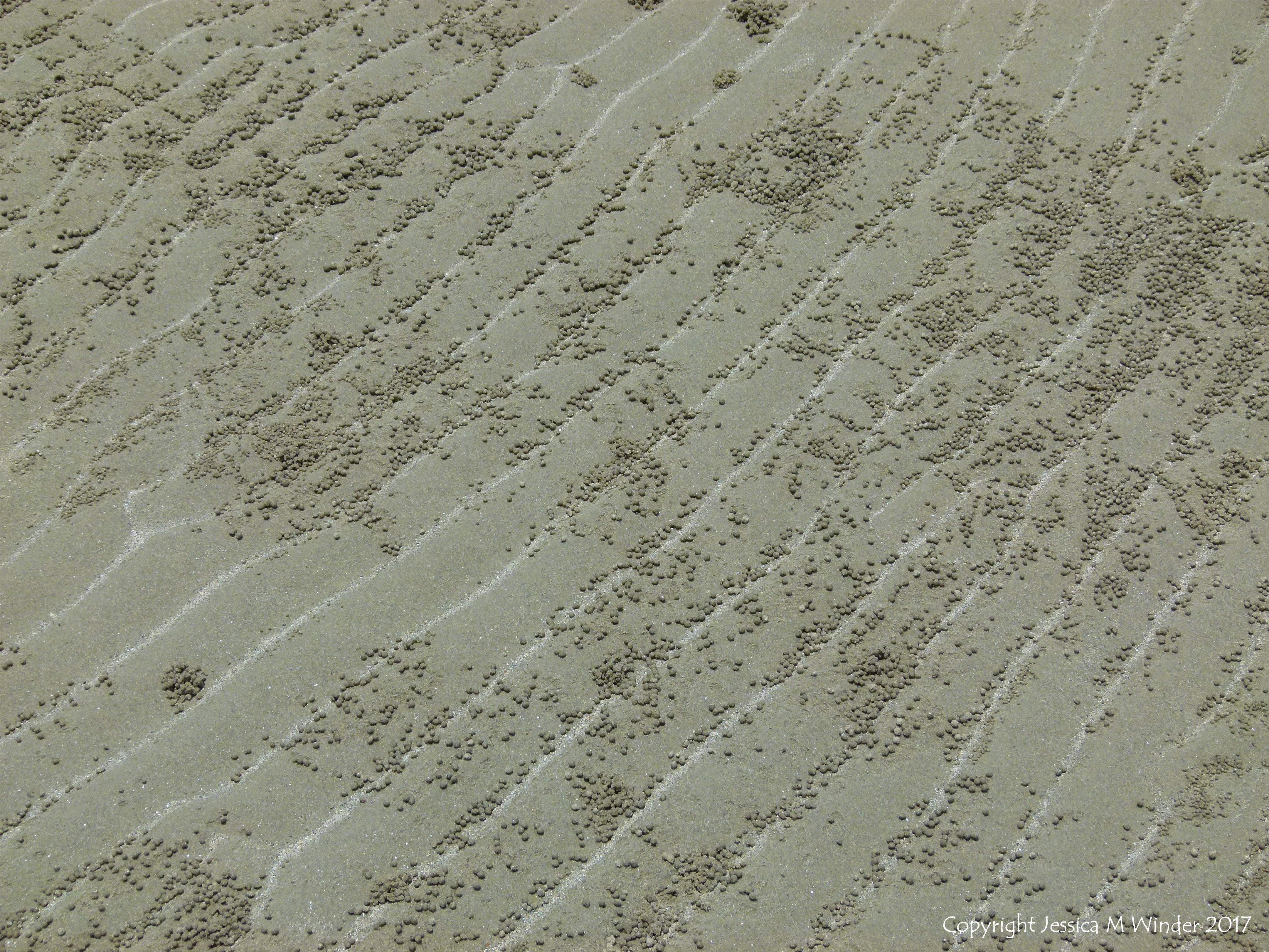 Sand Bubbler Crabs at Cape Tribulation 4 – Small ball-shaped sand pellets produced by the feeding activities of the Sand Bubbler Crab (Scopimera sp.) on the beach at Cape Tribulation in Queensland, Australia. Radiating lines of sandy balls surround each crab burrow. In this picture the crabs have burrowed into sand ripples and the balls have tended to roll down and accumulate in the grooves between the ridges rather than radiate out from the burrows.