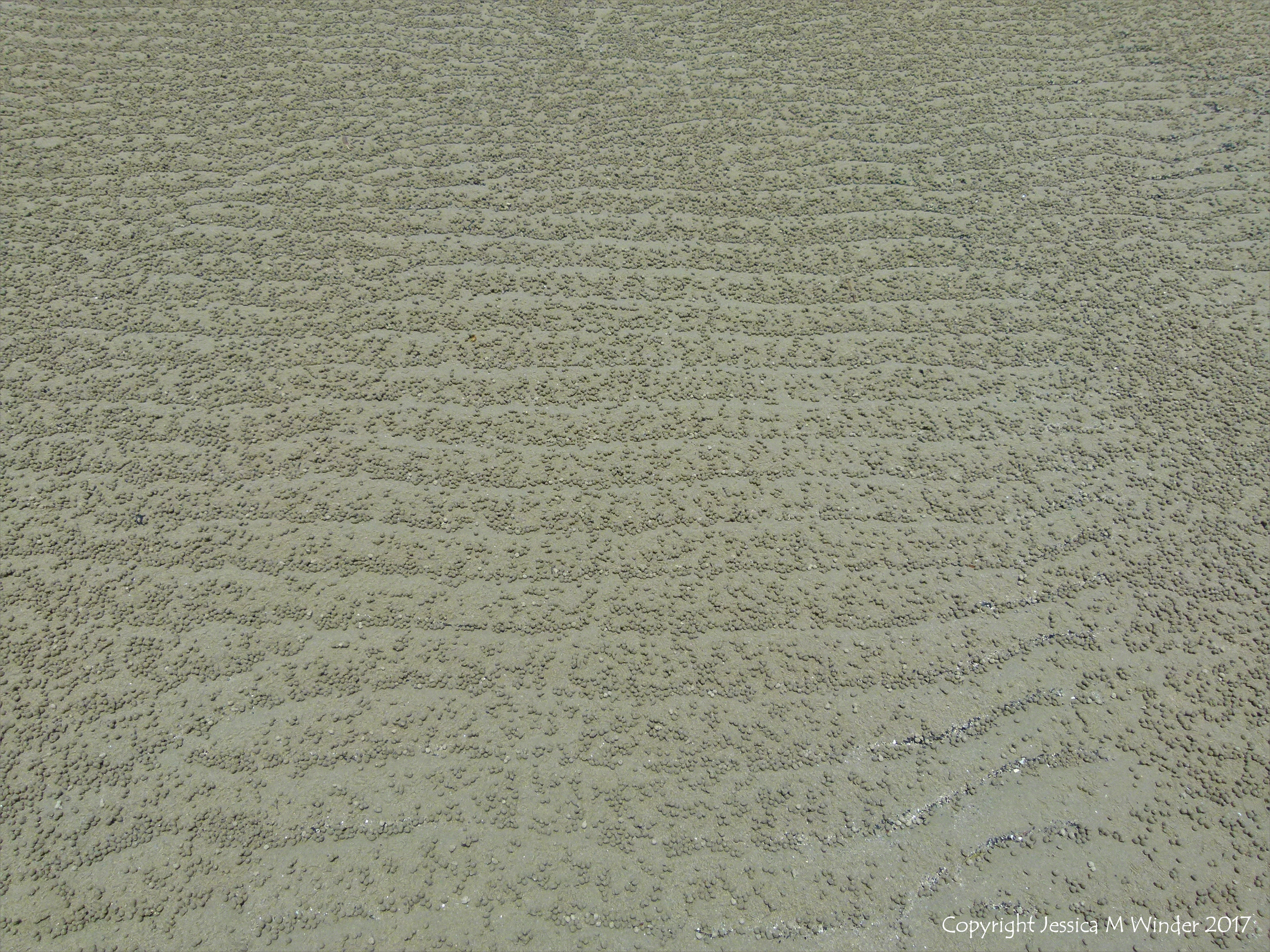Sand Bubbler Crabs at Cape Tribulation 5 – Small ball-shaped sand pellets produced by the feeding activities of the Sand Bubbler Crab (Scopimera sp.) on the beach at Cape Tribulation in Queensland, Australia. Radiating lines of sandy balls surround each crab burrow. In this picture the crabs have burrowed into sand ripples and the balls have tended to roll down and accumulate in the grooves between the ridges rather than radiate out from the burrows.
