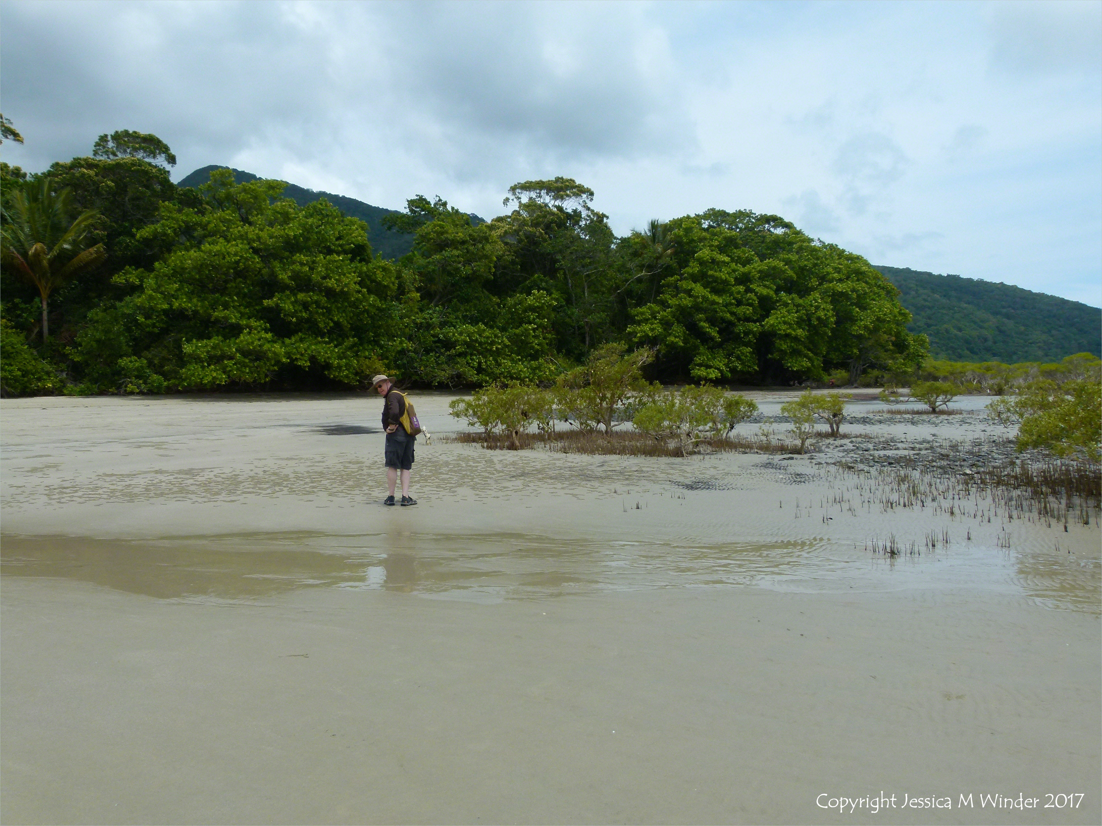 Patterns Made by Feeding Crabs 1 – Context shot of vegetated part of shore where sand pellet patterns were photographed. The patterns of sand pellets from the feeding activities of crabs occurred in the wetter enriched beach sediments near shore-growing vegetation on Cape Tribulation beach where the rainforest meets the sea in Queensland, Australia.